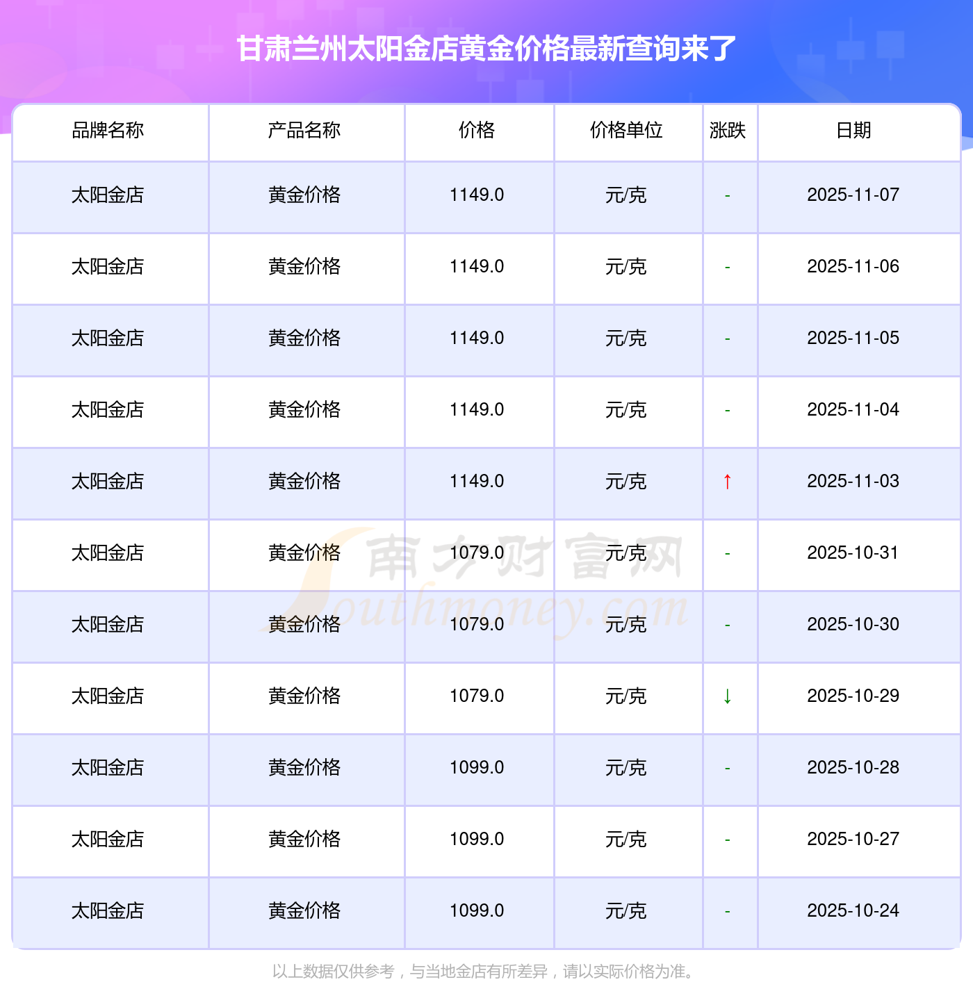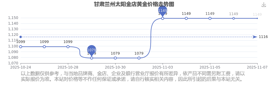 2025年11月8日,甘肅蘭州太陽(yáng)金店所售黃金價(jià)格,其價(jià)格設(shè)定為 1149.0元/克。