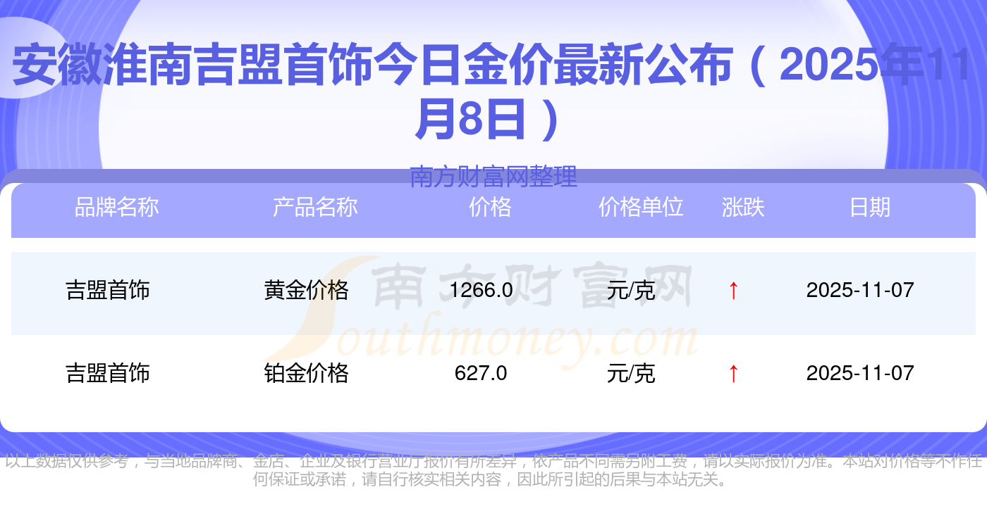 今日黃金價格是怎樣的?當(dāng)下黃金一克要賣多少錢?2025年11月8日安徽淮南吉盟首飾現(xiàn)在黃金一克要多少錢:銀條價格11.4元/克,黃金價格1263.0元/克,鉑金價格560.0元/克,金條價格(內(nèi)地)1202.0元/克,金飾價格(內(nèi)地)1268.0元/克,黃金飾品(香港)44260.0,鉑金飾品(香港)13080.0,金條金價(香港)39960.0,投資金條1243.0元/克,工藝金條1258.0元/克,千足金首飾1248.0元/克。