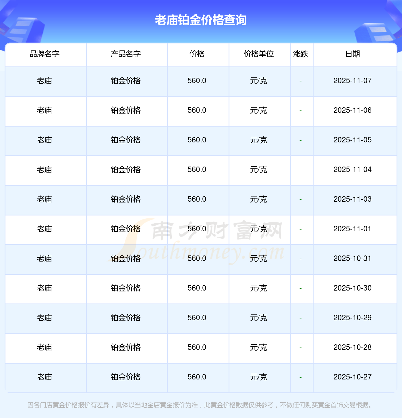 今日老廟鉑金價(jià)格最新查詢:560.0元/克。