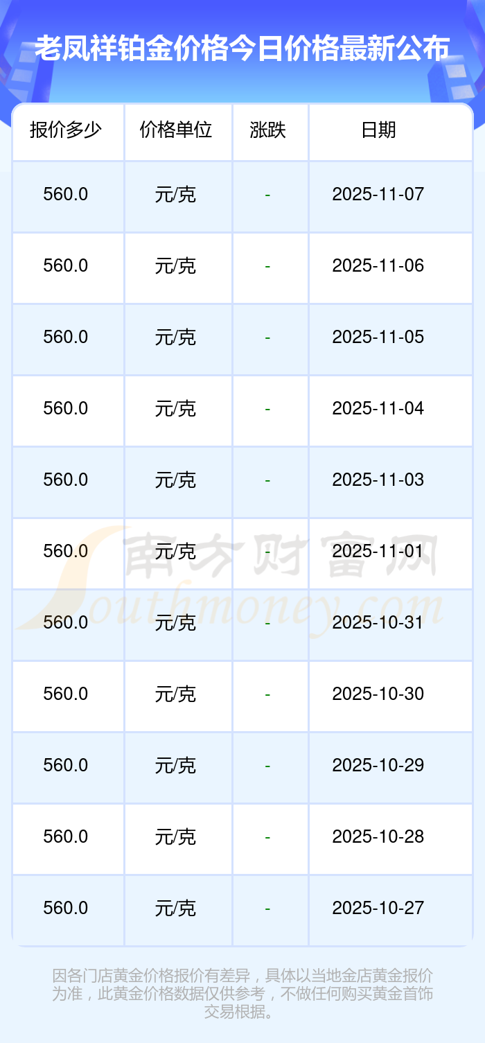 當(dāng)下,老鳳祥 鉑金價(jià)格今日的最新價(jià)格是560.0元/克。