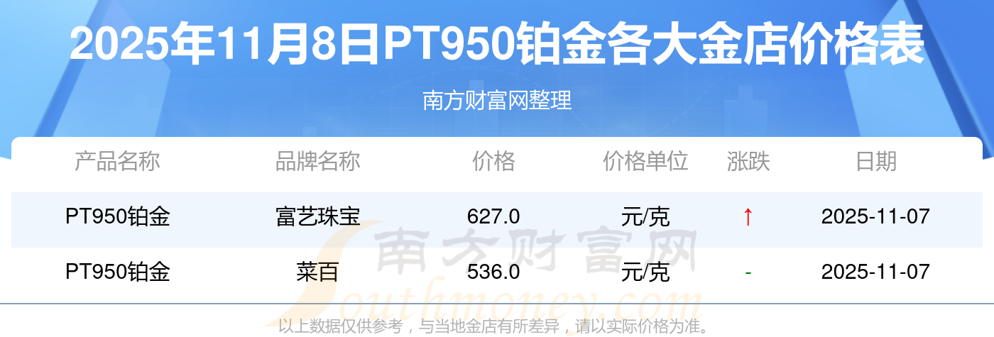 今天是2025年11月8日,寶泉錢幣、金蘭首飾、金蘭首飾、謝瑞麟、謝瑞麟、謝瑞麟、謝瑞麟、謝瑞麟、金銀街、金銀街、金銀街等各大金店品牌PT950鉑金最新價(jià)格如下:寶泉錢幣11.4元/克、金蘭首飾1263.0元/克、金蘭首飾560.0元/克、謝瑞麟1202.0元/克、謝瑞麟1268.0元/克、謝瑞麟44260.0、謝瑞麟13080.0、謝瑞麟39960.0、金銀街1243.0元/克、金銀街1258.0元/克、金銀街1248.0元/克。