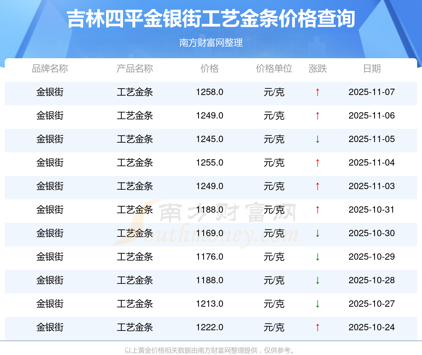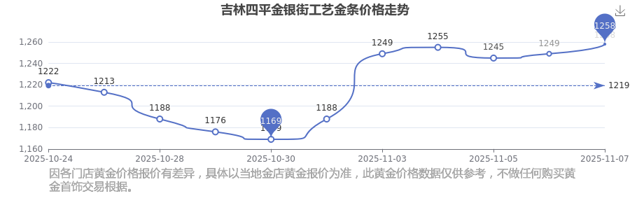 2025年11月8日吉林四平金銀街工藝金條價(jià)格是1258.0元/克。