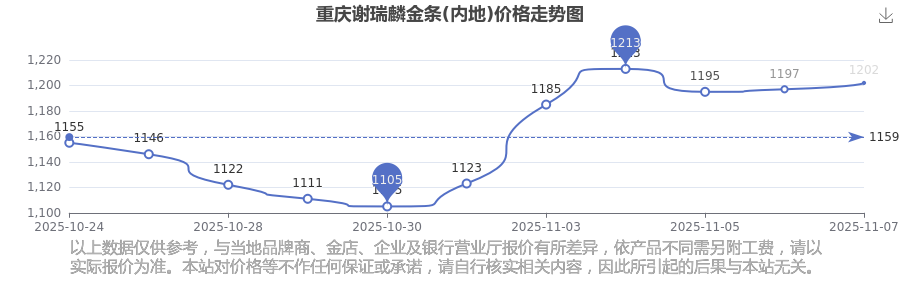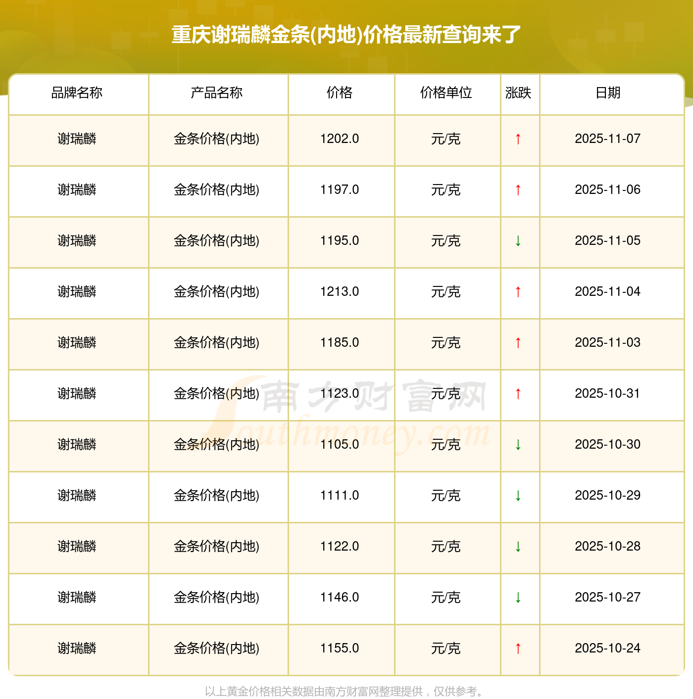 于 2025年11月8日,重慶謝瑞麟金條價格(內(nèi)地)的克價為1202.0元/克。