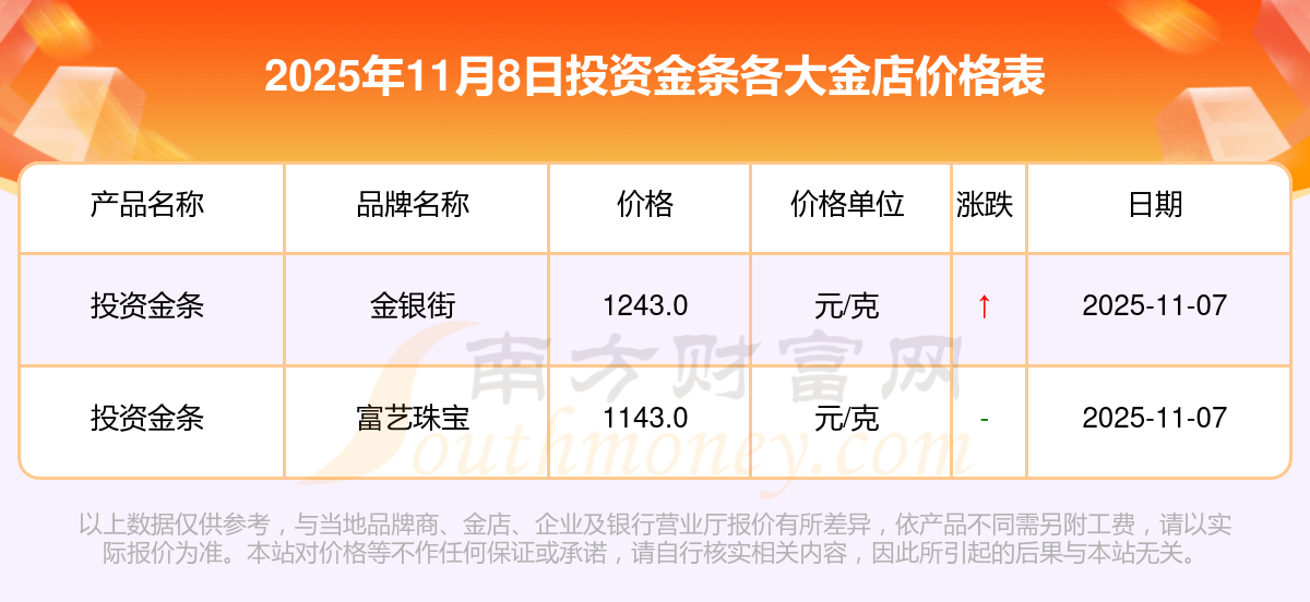 2025年11月8日各大金店投資金條最新價(jià)格:寶泉錢幣11.4元/克,金蘭首飾1263.0元/克,金蘭首飾560.0元/克,謝瑞麟1202.0元/克,謝瑞麟1268.0元/克,謝瑞麟44260.0,謝瑞麟13080.0,謝瑞麟39960.0,金銀街1243.0元/克,金銀街1258.0元/克,金銀街1248.0元/克。