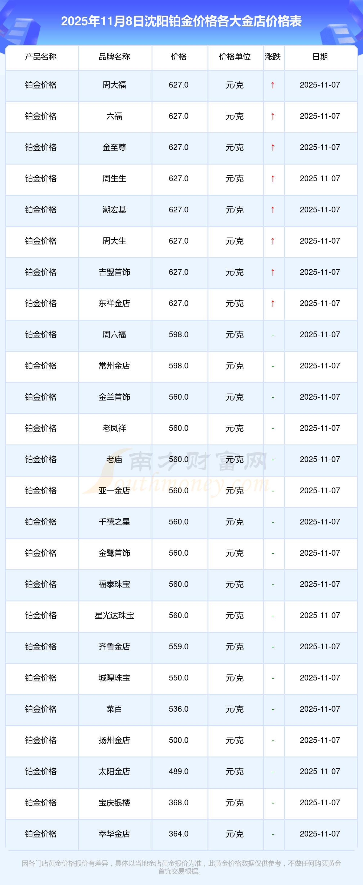 2025年11月8日沈陽寶泉錢幣、金蘭首飾、金蘭首飾、謝瑞麟、謝瑞麟、謝瑞麟、謝瑞麟、謝瑞麟、金銀街、金銀街、金銀街等各大金店品牌鉑金價格最新價格如下:寶泉錢幣銀條價格11.4元/克,金蘭首飾黃金價格1263.0元/克,金蘭首飾鉑金價格560.0元/克,謝瑞麟金條價格(內(nèi)地)1202.0元/克,謝瑞麟金飾價格(內(nèi)地)1268.0元/克,謝瑞麟黃金飾品(香港)44260.0,謝瑞麟鉑金飾品(香港)13080.0,謝瑞麟金條金價(香港)39960.0,金銀街投資金條1243.0元/克,金銀街工藝金條1258.0元/克,金銀街千足金首飾1248.0元/克。