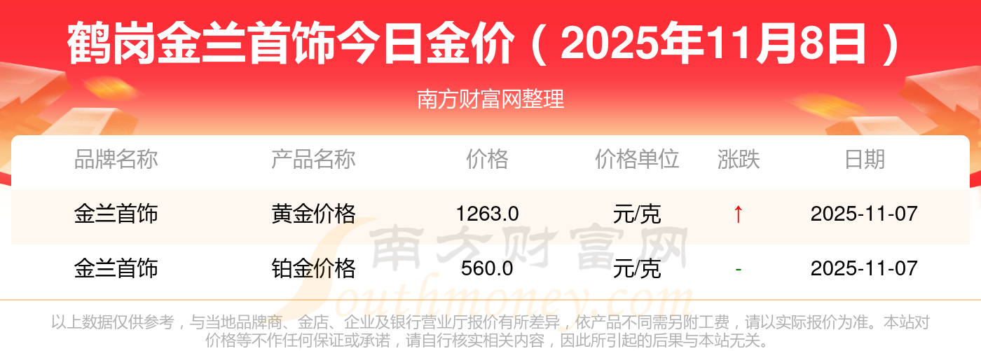 2025年11月8日鶴崗金蘭首飾黃金按克計(jì)價(jià),現(xiàn)在多少錢一克?銀條價(jià)格11.4元/克,黃金價(jià)格1263.0元/克,鉑金價(jià)格560.0元/克,金條價(jià)格(內(nèi)地)1202.0元/克,金飾價(jià)格(內(nèi)地)1268.0元/克,黃金飾品(香港)44260.0,鉑金飾品(香港)13080.0,金條金價(jià)(香港)39960.0,投資金條1243.0元/克,工藝金條1258.0元/克,千足金首飾1248.0元/克。