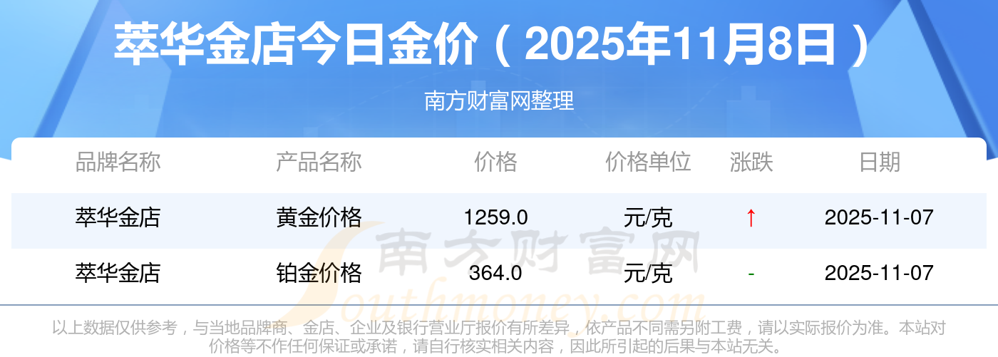 2025年11月8日萃華金店最新價(jià)格:銀條價(jià)格11.4元/克,黃金價(jià)格1263.0元/克,鉑金價(jià)格560.0元/克,金條價(jià)格(內(nèi)地)1202.0元/克,金飾價(jià)格(內(nèi)地)1268.0元/克,黃金飾品(香港)44260.0,鉑金飾品(香港)13080.0,金條金價(jià)(香港)39960.0,投資金條1243.0元/克,工藝金條1258.0元/克,千足金首飾1248.0元/克。