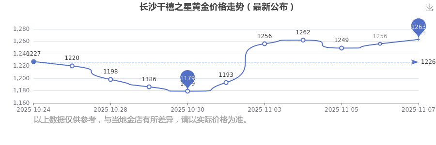 今日長沙千禧之星黃金價格查詢,1263.0元/克,此乃長沙千禧之星于 2025年11月8日黃金價格的掛牌價格。