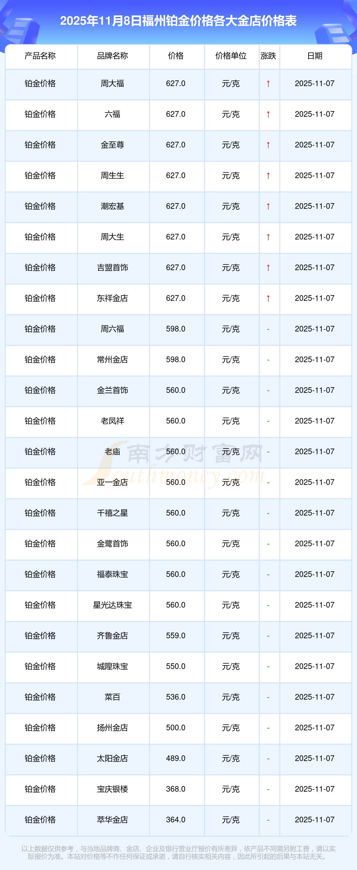 2025年11月8日福州各大金店鉑金價(jià)格最新價(jià)格:寶泉錢(qián)幣11.4元/克,金蘭首飾1263.0元/克,金蘭首飾560.0元/克,謝瑞麟1202.0元/克,謝瑞麟1268.0元/克,謝瑞麟44260.0,謝瑞麟13080.0,謝瑞麟39960.0,金銀街1243.0元/克,金銀街1258.0元/克,金銀街1248.0元/克。
