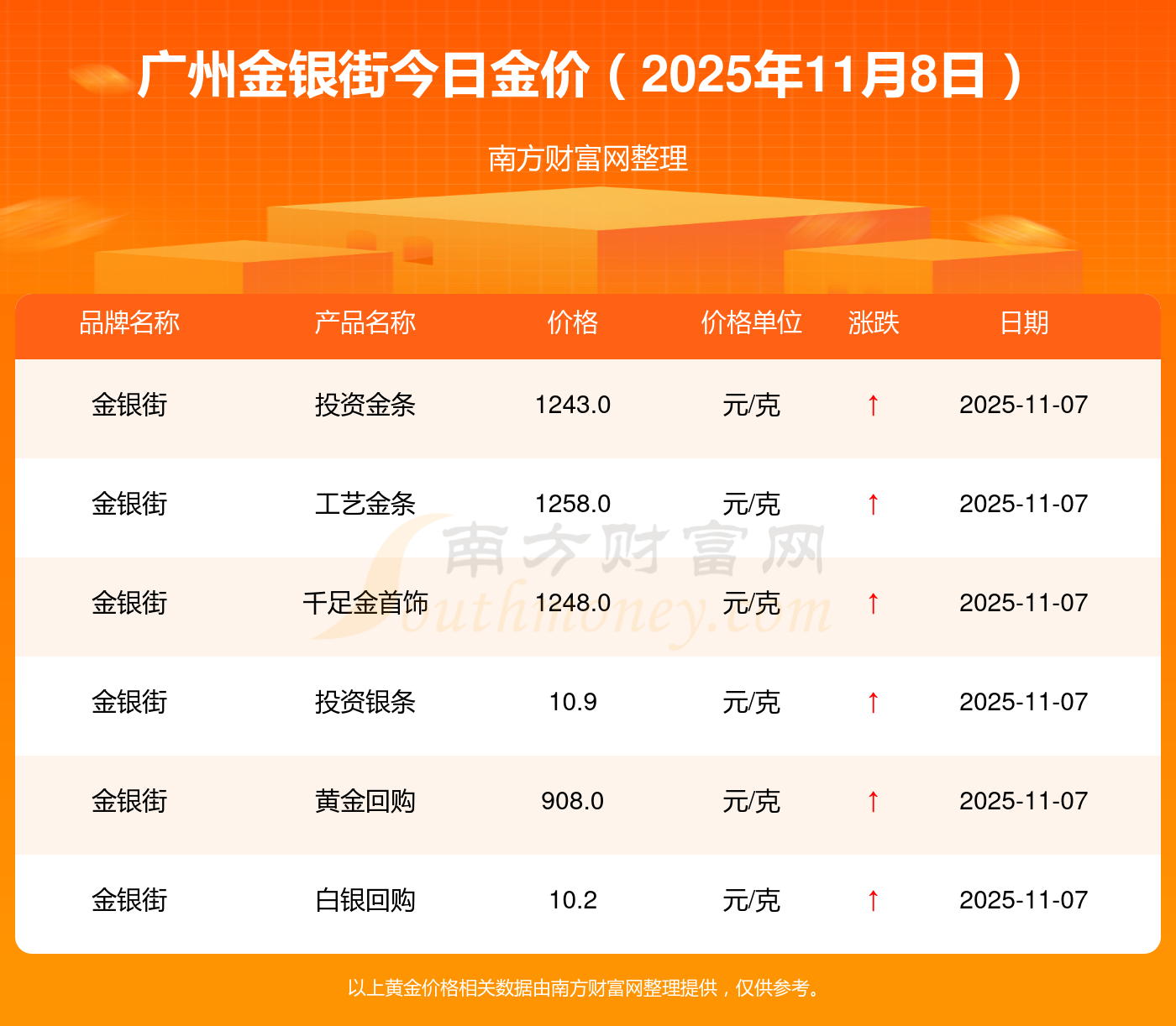 2025年11月8日廣州金銀街一克黃金的售價是多少:銀條價格11.4元/克,黃金價格1263.0元/克,鉑金價格560.0元/克,金條價格(內(nèi)地)1202.0元/克,金飾價格(內(nèi)地)1268.0元/克,黃金飾品(香港)44260.0,鉑金飾品(香港)13080.0,金條金價(香港)39960.0,投資金條1243.0元/克,工藝金條1258.0元/克,千足金首飾1248.0元/克。