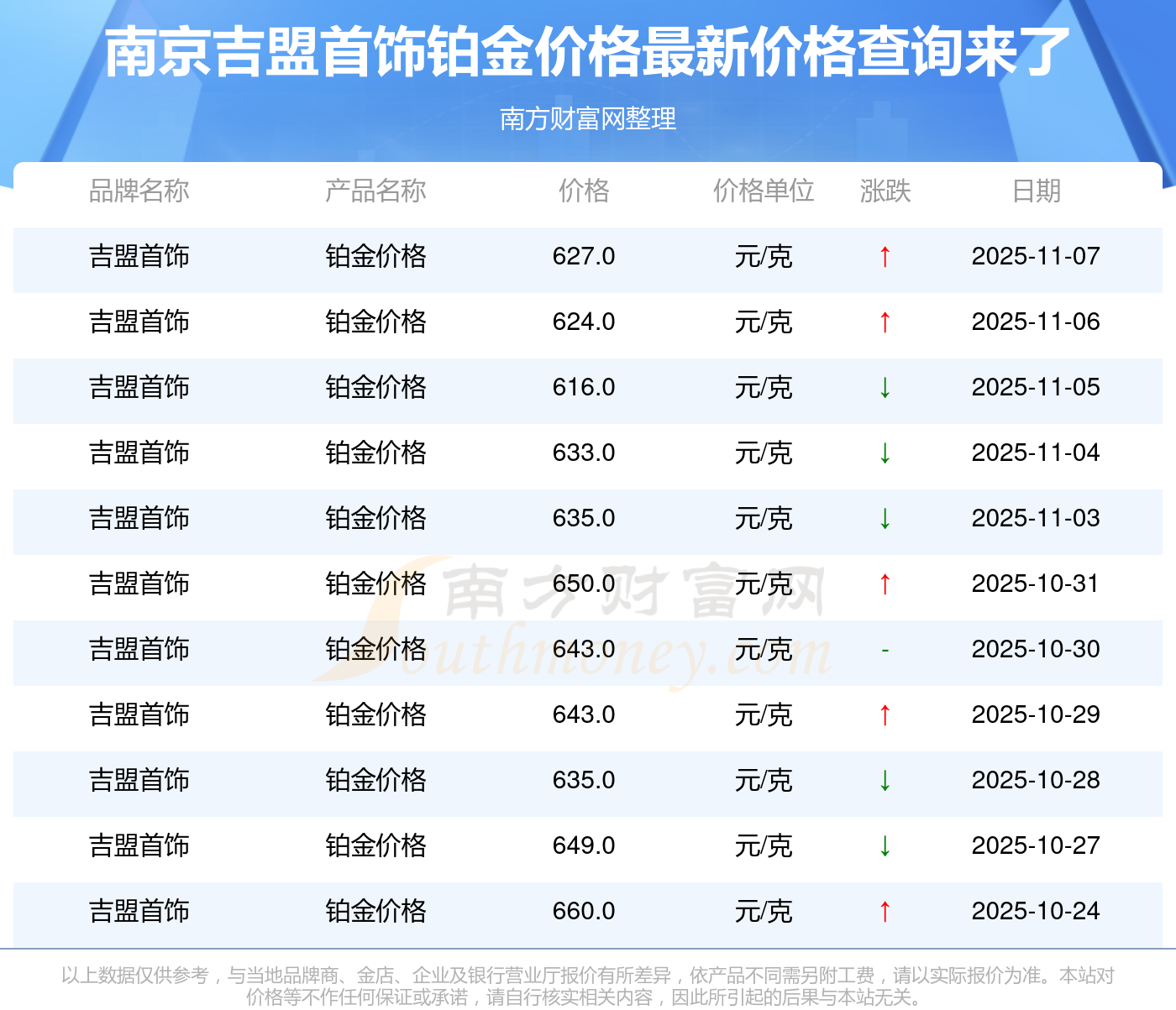 627.0元/克,這是南京吉盟首飾于 2025年11月8日所定的鉑金價格。