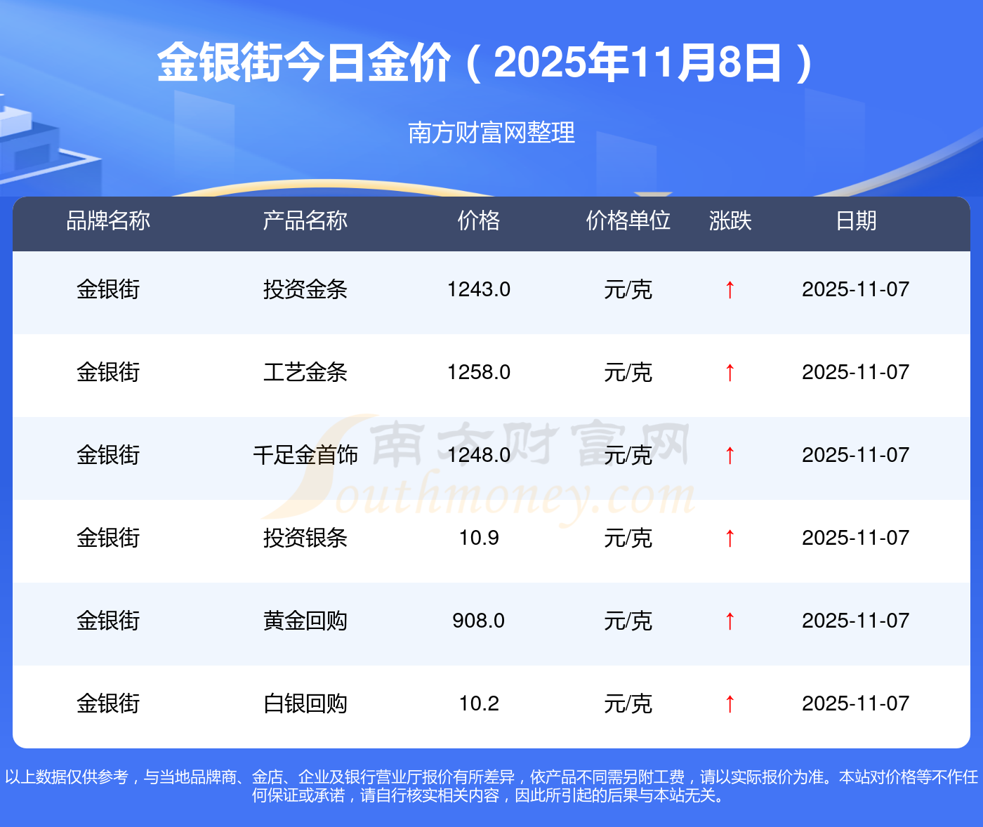 2025年11月8日金銀街今日價格:銀條價格11.4元/克,黃金價格1263.0元/克,鉑金價格560.0元/克,金條價格(內(nèi)地)1202.0元/克,金飾價格(內(nèi)地)1268.0元/克,黃金飾品(香港)44260.0,鉑金飾品(香港)13080.0,金條金價(香港)39960.0,投資金條1243.0元/克,工藝金條1258.0元/克,千足金首飾1248.0元/克。