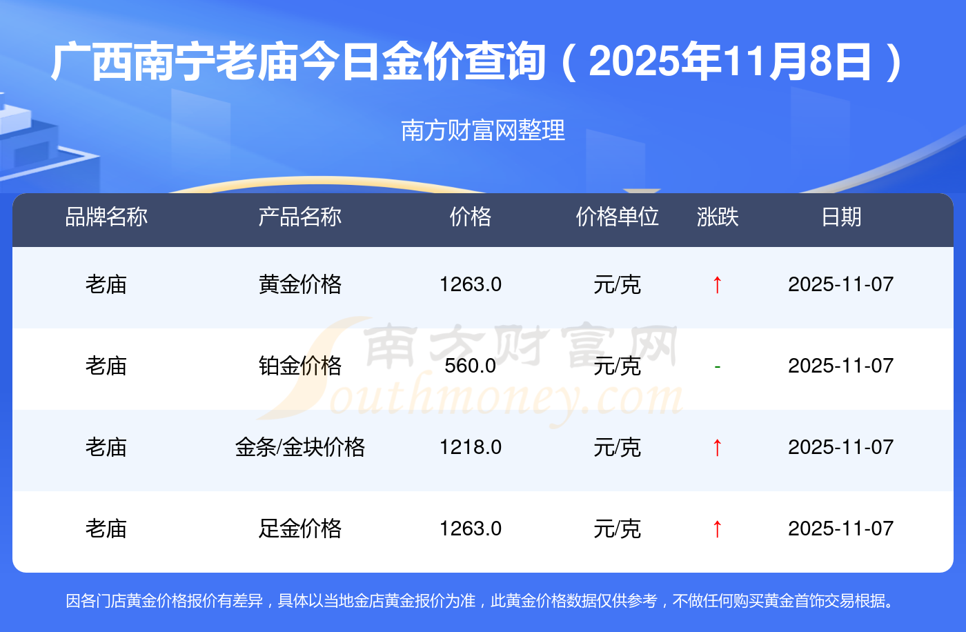 2025年11月8日廣西南寧老廟黃金的單價,一克為多少?銀條價格11.4元/克,黃金價格1263.0元/克,鉑金價格560.0元/克,金條價格(內(nèi)地)1202.0元/克,金飾價格(內(nèi)地)1268.0元/克,黃金飾品(香港)44260.0,鉑金飾品(香港)13080.0,金條金價(香港)39960.0,投資金條1243.0元/克,工藝金條1258.0元/克,千足金首飾1248.0元/克。