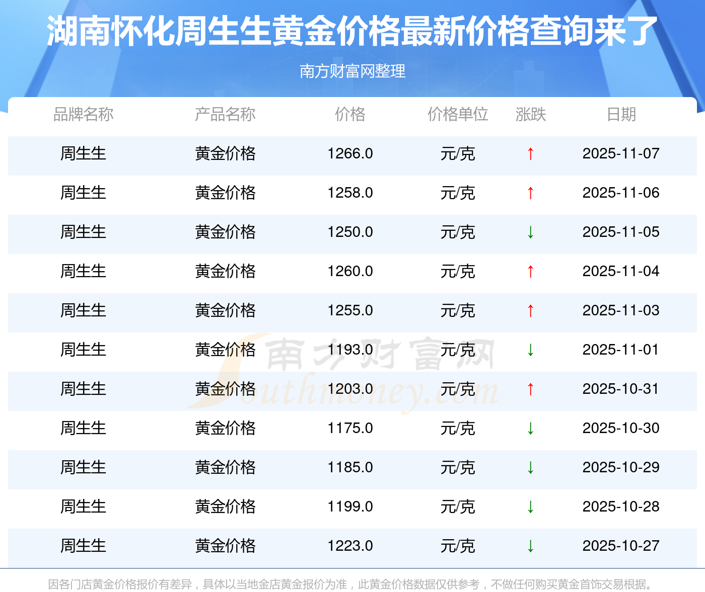 今日湖南??化周生生黃金價格公布黃金價格今天多少一克今日(2025年11月8日),湖南??化周生生黃金價格每克的價值為1266.0元/克。