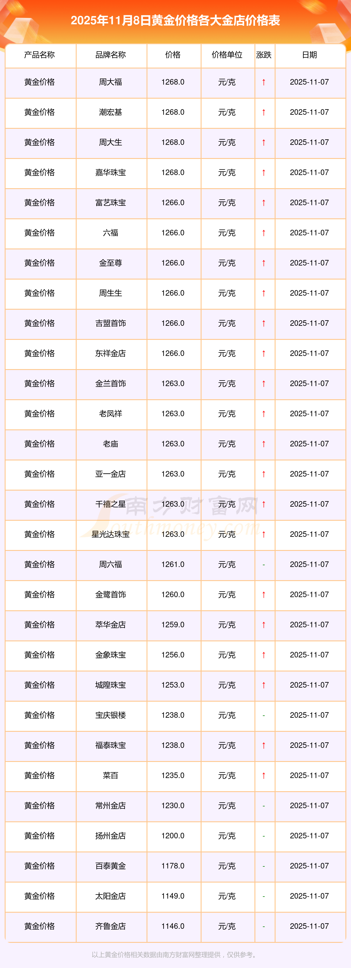 今天是2025年11月8日,寶泉錢幣、金蘭首飾、金蘭首飾、謝瑞麟、謝瑞麟、謝瑞麟、謝瑞麟、謝瑞麟、金銀街、金銀街、金銀街等各大金店品牌黃金價(jià)格最新價(jià)格如下:寶泉錢幣11.4元/克、金蘭首飾1263.0元/克、金蘭首飾560.0元/克、謝瑞麟1202.0元/克、謝瑞麟1268.0元/克、謝瑞麟44260.0、謝瑞麟13080.0、謝瑞麟39960.0、金銀街1243.0元/克、金銀街1258.0元/克、金銀街1248.0元/克。