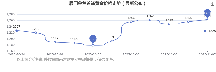 2025年11月8日當(dāng)天,廈門金蘭首飾黃金價(jià)格的單價(jià)是 1263.0元/克。