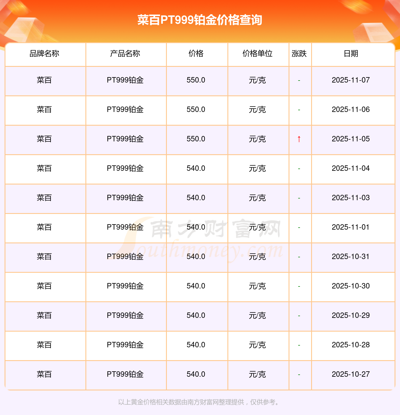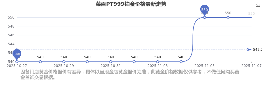 菜百 PT999鉑金今日最新的價(jià)位是550.0元/克。