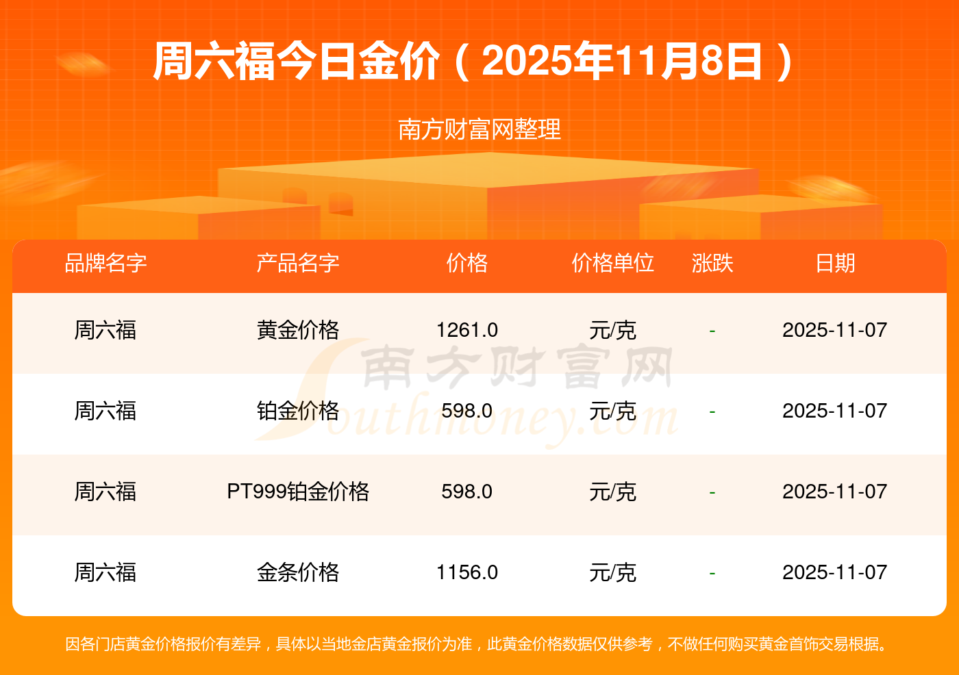 現(xiàn)在周六福黃金價(jià)格是多少錢1克_2025年周六福今日金價(jià)是多少錢一克,最新周六福查詢,2025年11月8日周六福鉑金價(jià)格現(xiàn)在每克多少錢?最新周六福鉑金價(jià)格報(bào)價(jià)公布,一起來看看吧!