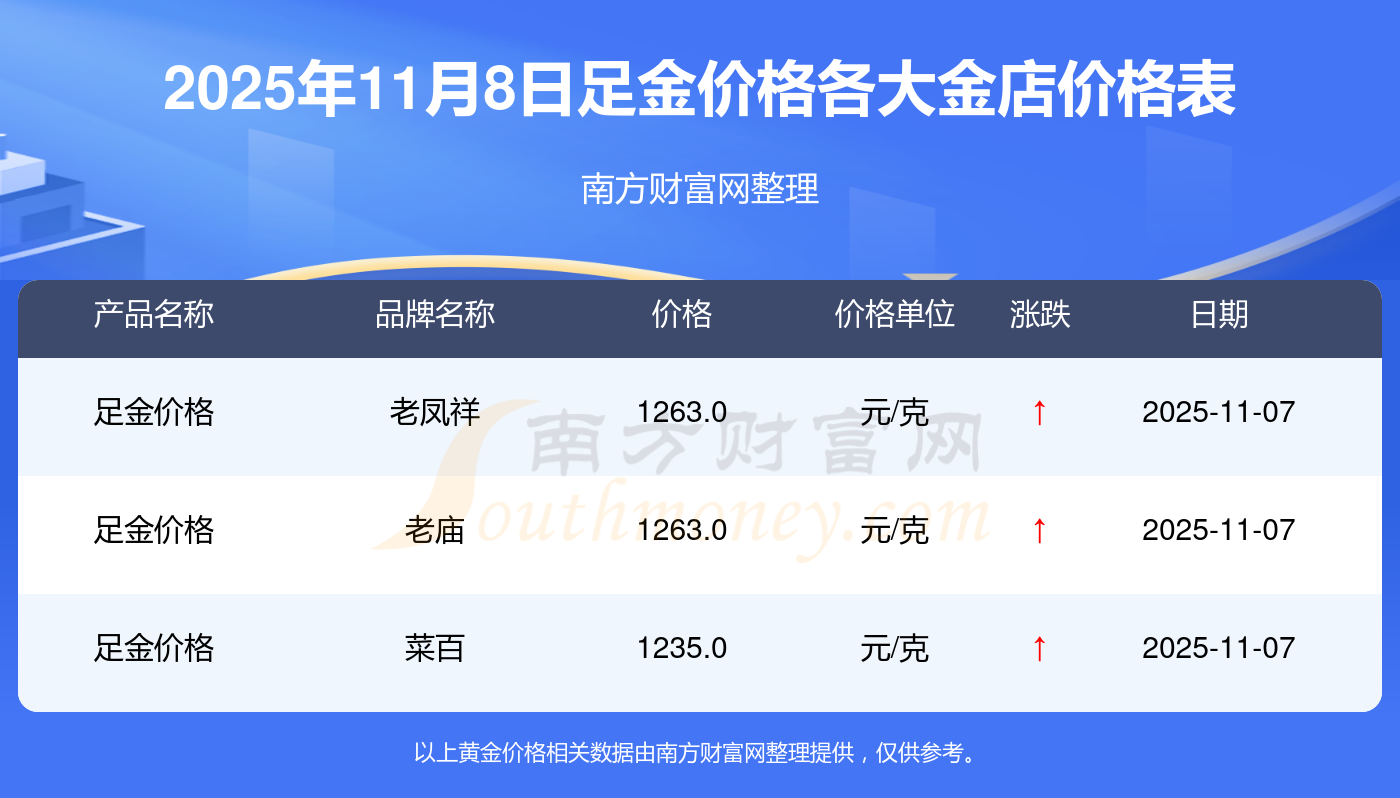 2025年11月8日各大金店足金價格最新價格:寶泉錢幣11.4元/克,金蘭首飾1263.0元/克,金蘭首飾560.0元/克,謝瑞麟1202.0元/克,謝瑞麟1268.0元/克,謝瑞麟44260.0,謝瑞麟13080.0,謝瑞麟39960.0,金銀街1243.0元/克,金銀街1258.0元/克,金銀街1248.0元/克。