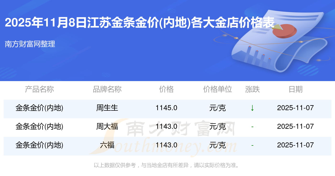 今天是2025年11月8日,江蘇寶泉錢幣、金蘭首飾、金蘭首飾、謝瑞麟、謝瑞麟、謝瑞麟、謝瑞麟、謝瑞麟、金銀街、金銀街、金銀街等各大金店品牌金條金價(jià)(內(nèi)地)最新價(jià)格行情是這樣的:寶泉錢幣11.4元/克、金蘭首飾1263.0元/克、金蘭首飾560.0元/克、謝瑞麟1202.0元/克、謝瑞麟1268.0元/克、謝瑞麟44260.0、謝瑞麟13080.0、謝瑞麟39960.0、金銀街1243.0元/克、金銀街1258.0元/克、金銀街1248.0元/克。