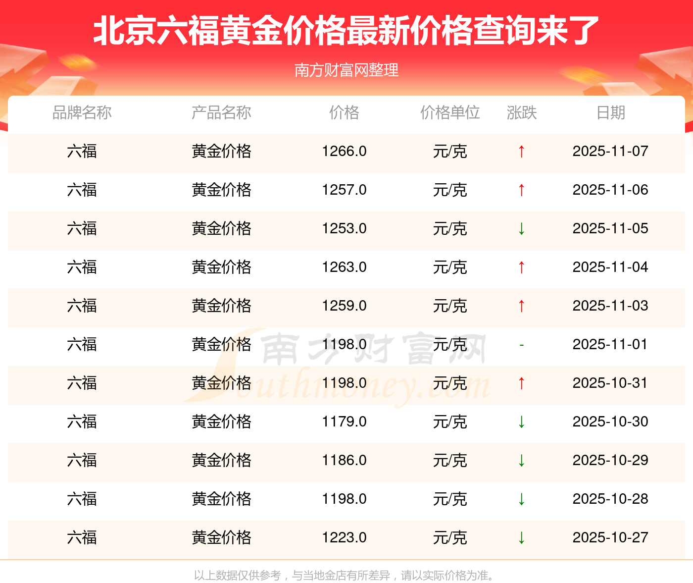 今天黃金每克能賣多少錢?今日北京六福黃金價(jià)格查詢,今日北京六福黃金價(jià)格最新為:1266.0元/克。
