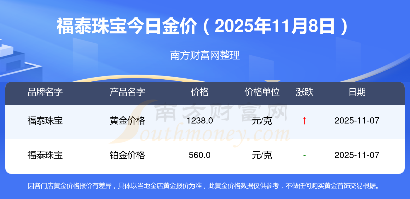 現(xiàn)在福泰珠寶黃金價(jià)格是多少錢(qián)1克_2025年福泰珠寶今日金價(jià)是多少錢(qián)一克,最新福泰珠寶查詢,2025年11月8日福泰珠寶鉑金價(jià)格現(xiàn)在每克多少錢(qián)?最新福泰珠寶鉑金價(jià)格報(bào)價(jià)公布,一起來(lái)看看吧!