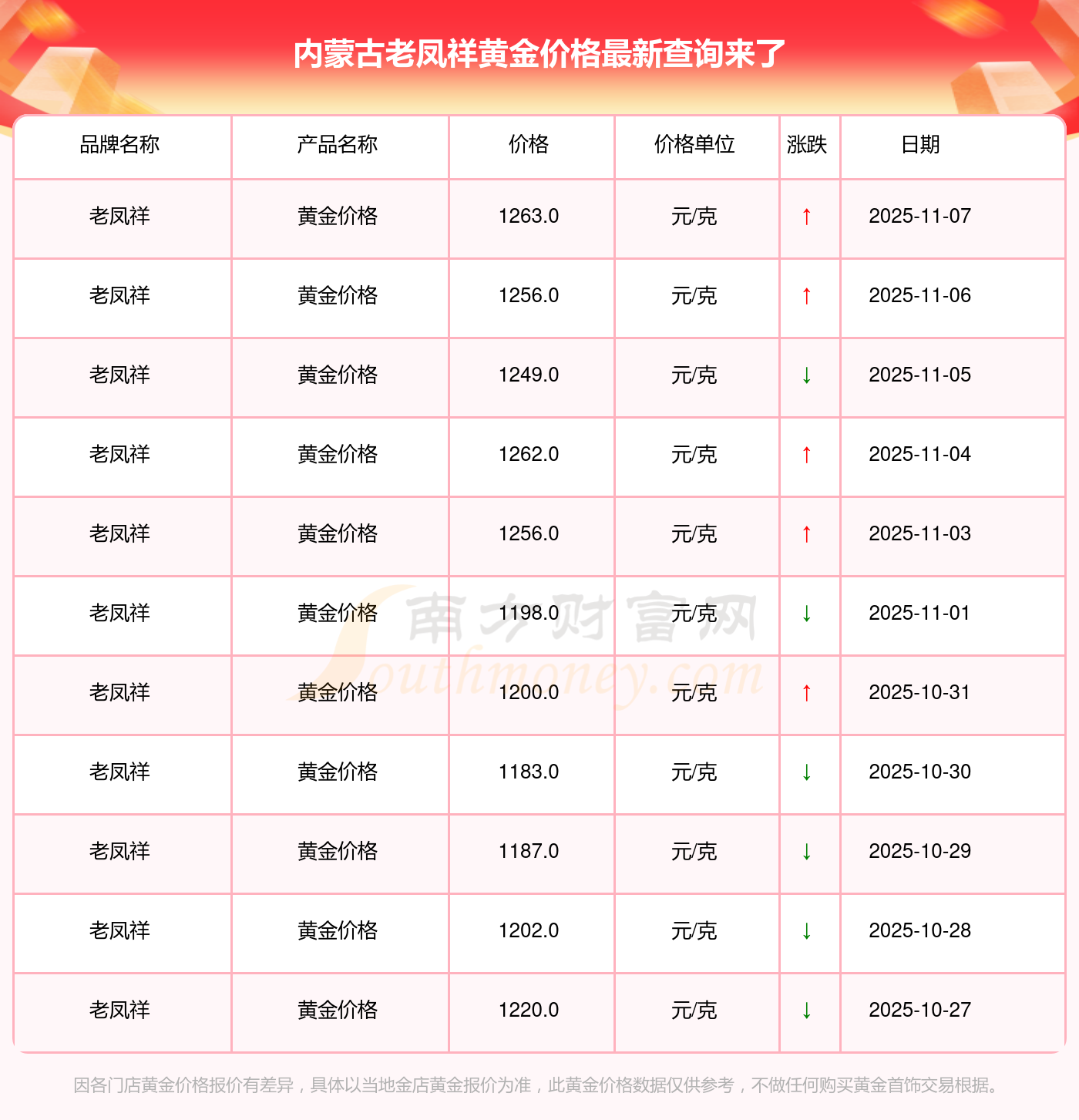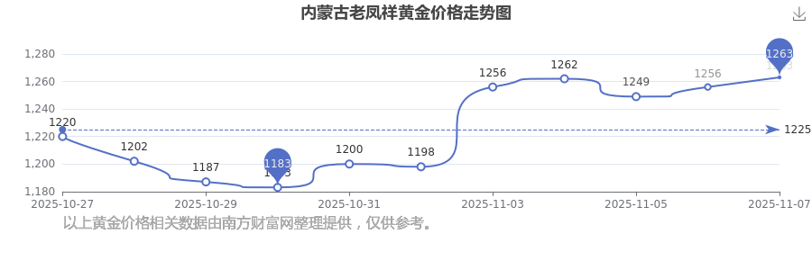 1263.0元/克的黃金價(jià)格,是內(nèi)蒙古老鳳祥在 2025年11月8日給出的。