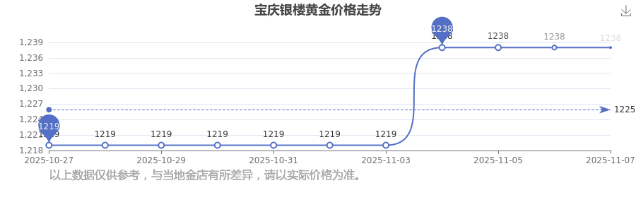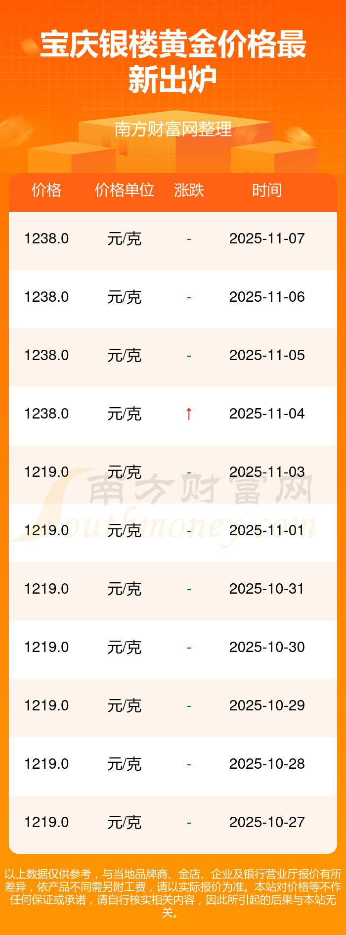 今日黃金售價是多少呢?此刻每克黃金價錢怎樣?一般情況下1克黃金的價格會在多少呢?寶慶銀樓今日 黃金價格的最新市場行情價為1238.0元/克。