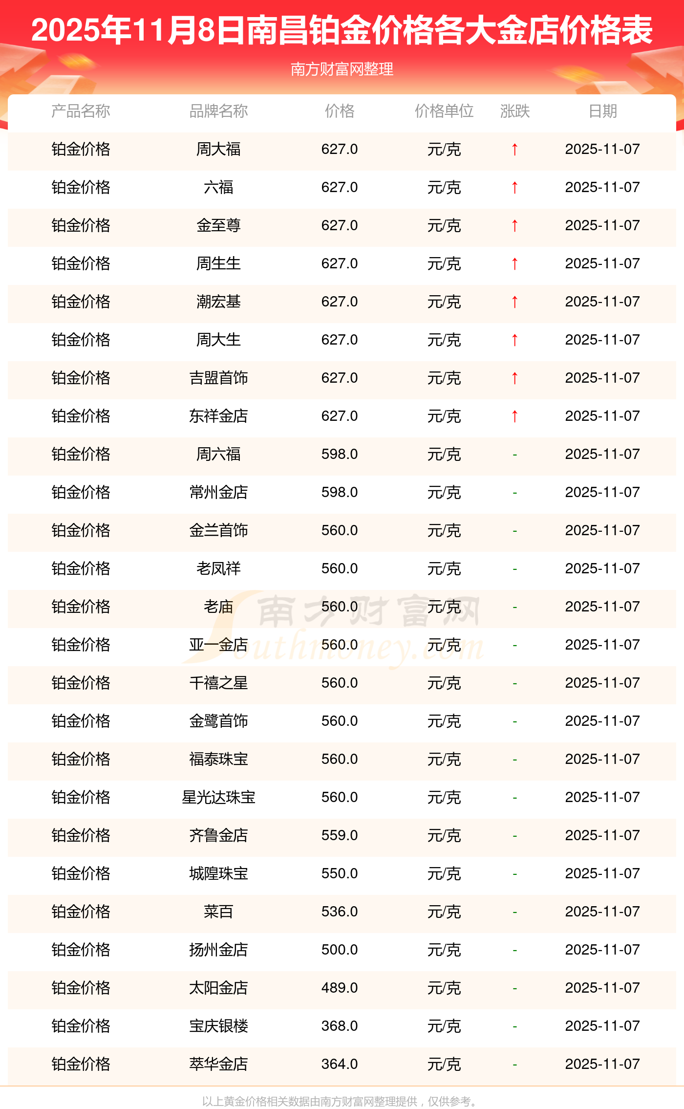 2025年11月8日南昌寶泉錢幣、金蘭首飾、金蘭首飾、謝瑞麟、謝瑞麟、謝瑞麟、謝瑞麟、謝瑞麟、金銀街、金銀街、金銀街等各大金店品牌鉑金價格最新價格如下:寶泉錢幣銀條價格11.4元/克,金蘭首飾黃金價格1263.0元/克,金蘭首飾鉑金價格560.0元/克,謝瑞麟金條價格(內地)1202.0元/克,謝瑞麟金飾價格(內地)1268.0元/克,謝瑞麟黃金飾品(香港)44260.0,謝瑞麟鉑金飾品(香港)13080.0,謝瑞麟金條金價(香港)39960.0,金銀街投資金條1243.0元/克,金銀街工藝金條1258.0元/克,金銀街千足金首飾1248.0元/克。