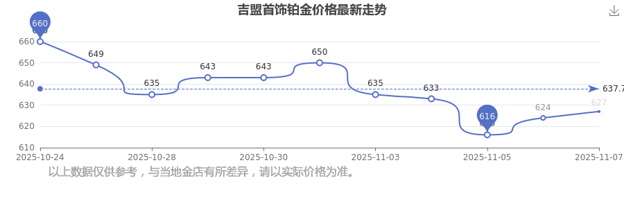 2025年11月8日吉盟首飾鉑金價格:627.0元/克。
