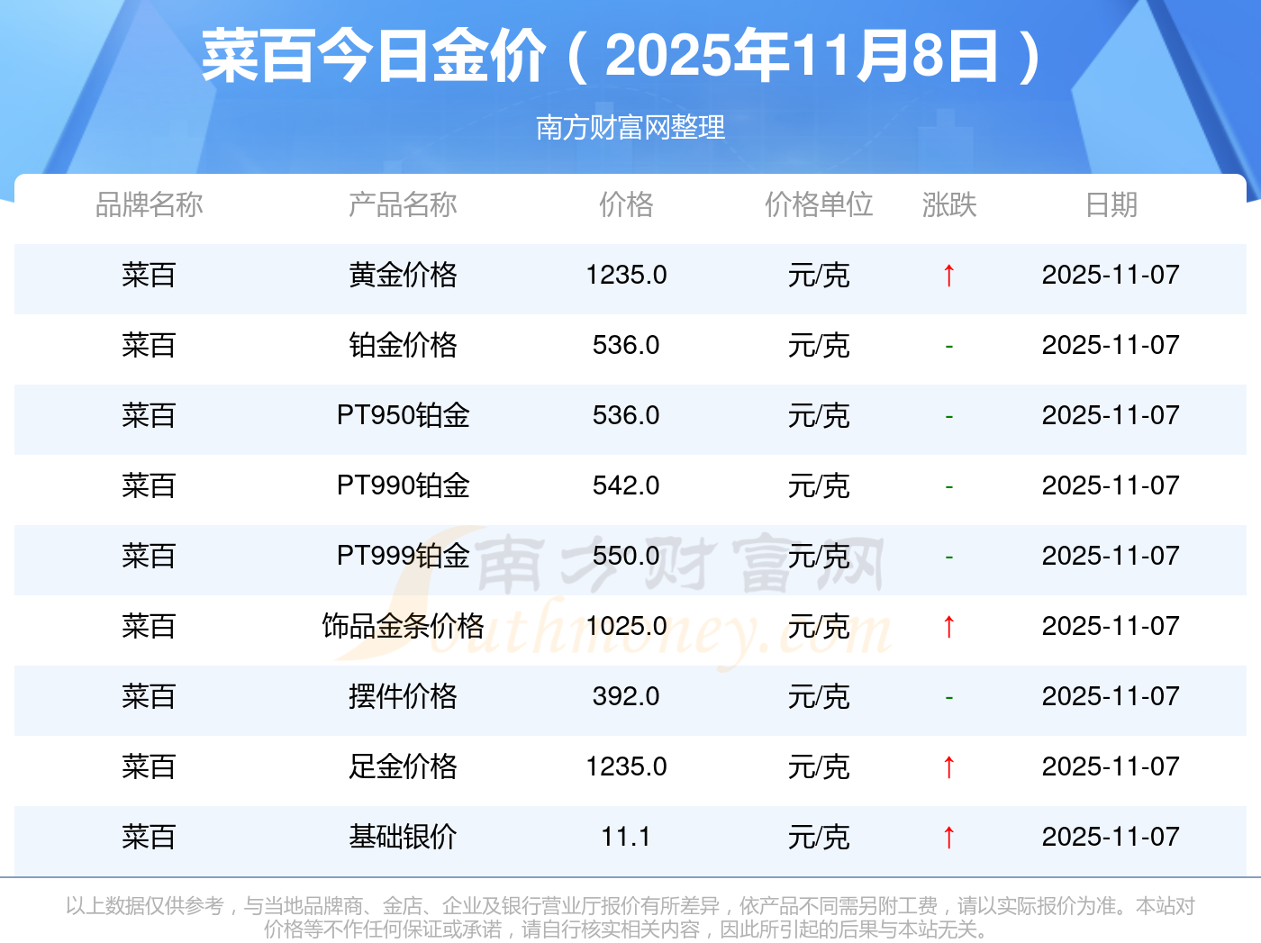 2025年11月8日菜百今日價格:銀條價格11.4元/克,黃金價格1263.0元/克,鉑金價格560.0元/克,金條價格(內(nèi)地)1202.0元/克,金飾價格(內(nèi)地)1268.0元/克,黃金飾品(香港)44260.0,鉑金飾品(香港)13080.0,金條金價(香港)39960.0,投資金條1243.0元/克,工藝金條1258.0元/克,千足金首飾1248.0元/克。