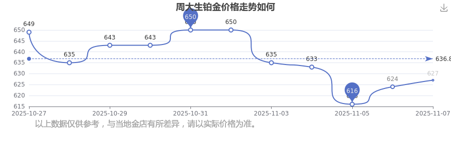 今日(2025年11月8日)周大生鉑金價(jià)格是627.0元/克。