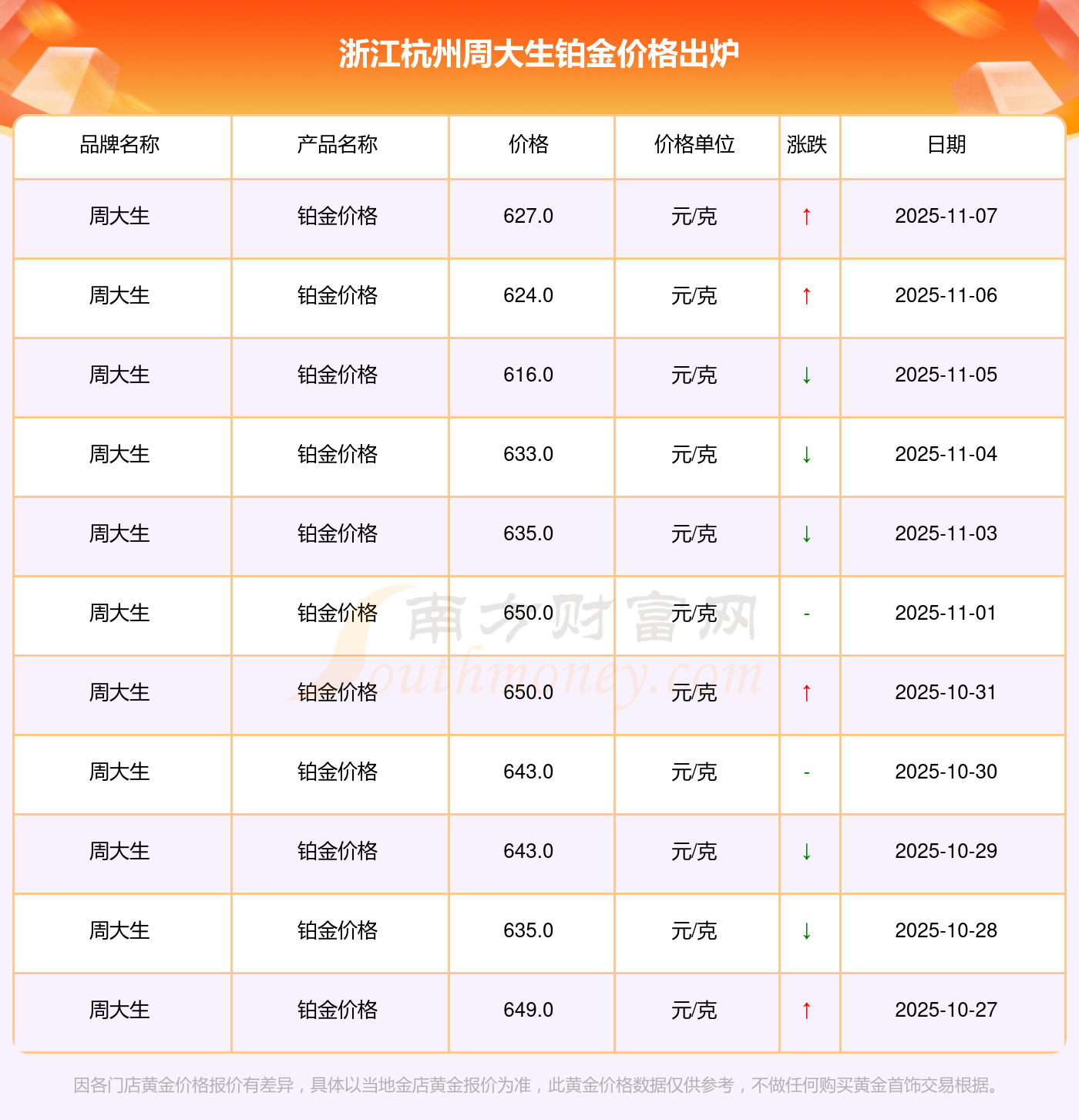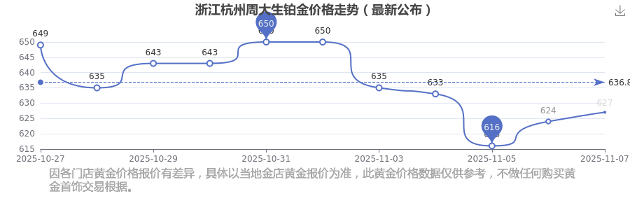 浙江杭州周大生鉑金價(jià)格在 2025年11月8日,其市場(chǎng)價(jià)格為 627.0元/克。