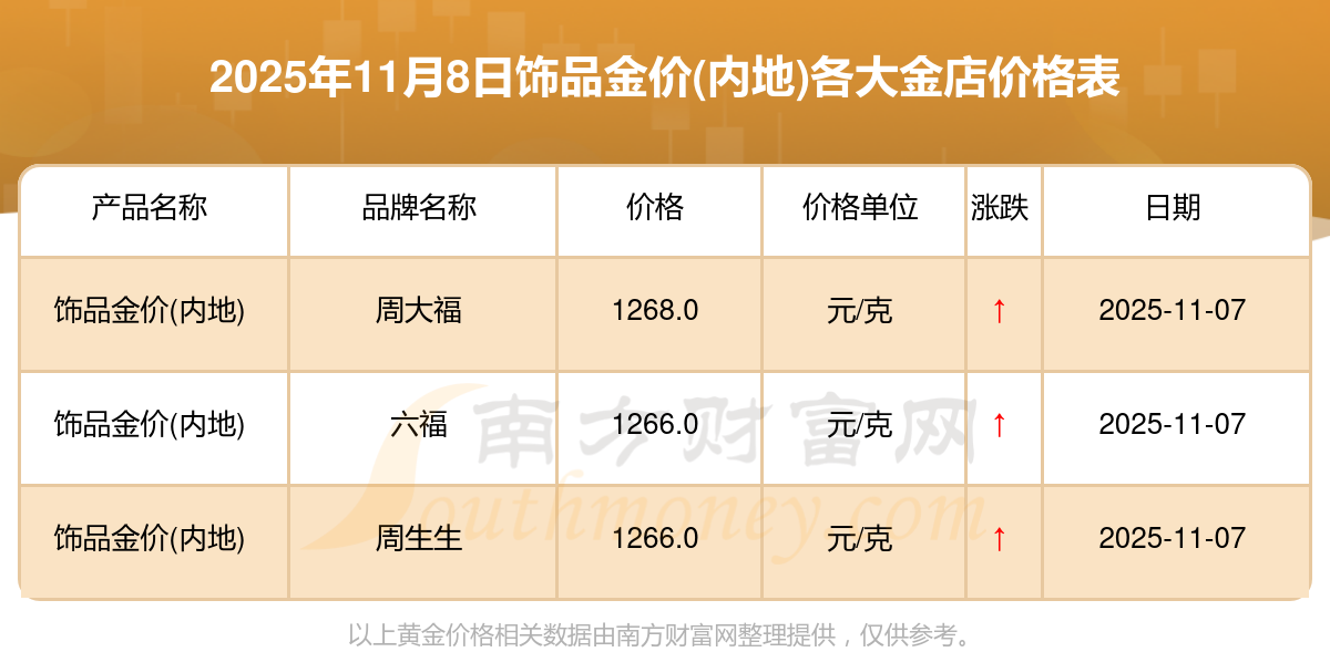 今天是2025年11月8日,寶泉錢幣、金蘭首飾、金蘭首飾、謝瑞麟、謝瑞麟、謝瑞麟、謝瑞麟、謝瑞麟、金銀街、金銀街、金銀街等各大金店品牌飾品金價(jià)(內(nèi)地)最新價(jià)格如下:寶泉錢幣11.4元/克、金蘭首飾1263.0元/克、金蘭首飾560.0元/克、謝瑞麟1202.0元/克、謝瑞麟1268.0元/克、謝瑞麟44260.0、謝瑞麟13080.0、謝瑞麟39960.0、金銀街1243.0元/克、金銀街1258.0元/克、金銀街1248.0元/克。