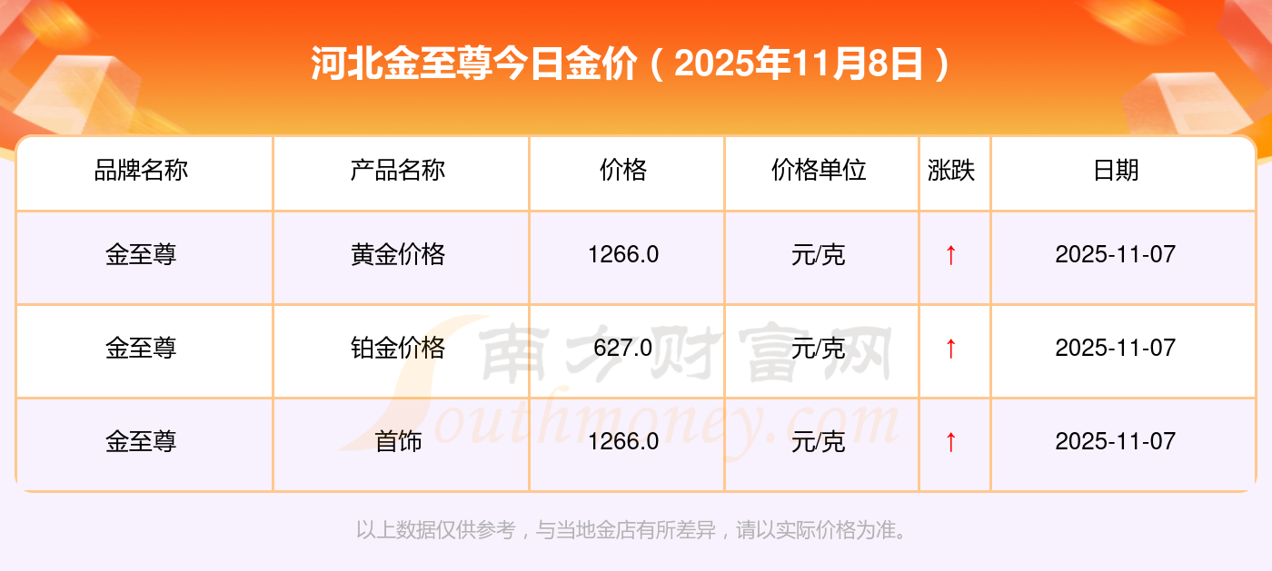 今日黃金售價是多少呢?此刻每克黃金價錢怎樣?2025年11月8日河北金至尊一克黃金對應的價格是多少?銀條價格11.4元/克,黃金價格1263.0元/克,鉑金價格560.0元/克,金條價格(內(nèi)地)1202.0元/克,金飾價格(內(nèi)地)1268.0元/克,黃金飾品(香港)44260.0,鉑金飾品(香港)13080.0,金條金價(香港)39960.0,投資金條1243.0元/克,工藝金條1258.0元/克,千足金首飾1248.0元/克。