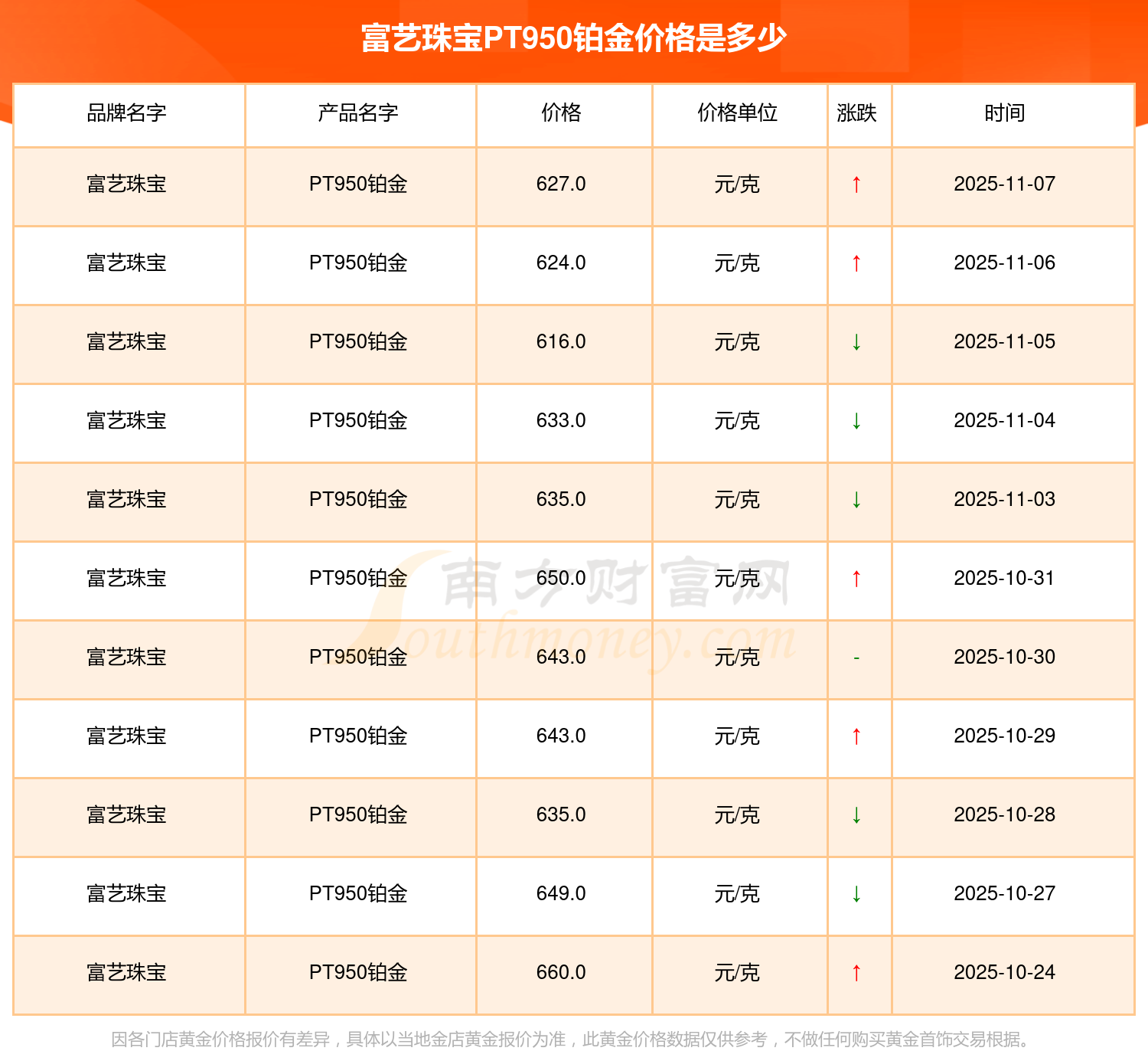 今日富藝珠寶PT950鉑金最新價(jià)格為627.0元/克。
