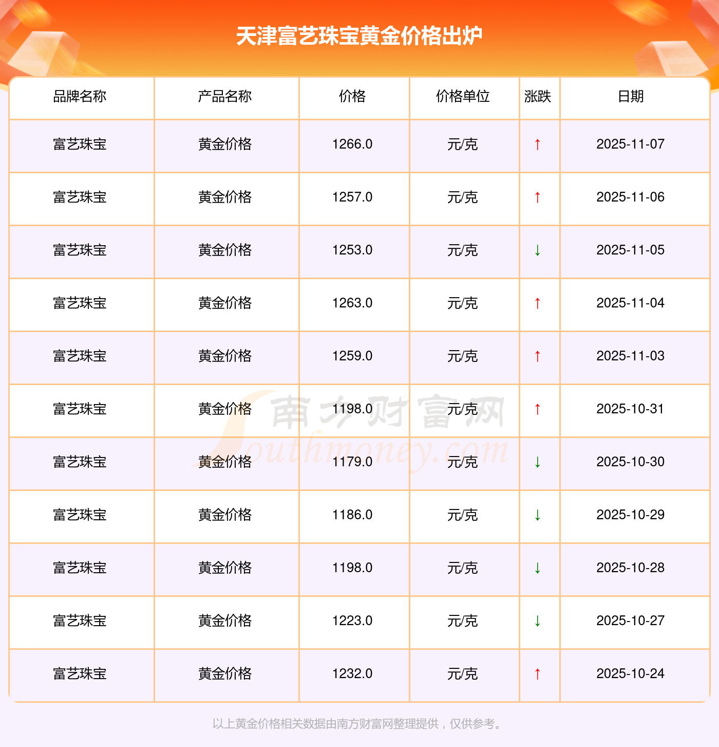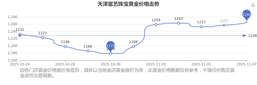 天津富藝珠寶今日黃金價(jià)格每克多少錢?此刻一克黃金的售賣價(jià)是多少?今日天津富藝珠寶黃金價(jià)格查詢,天津富藝珠寶黃金價(jià)格在 2025年11月8日為 1266.0元/克。