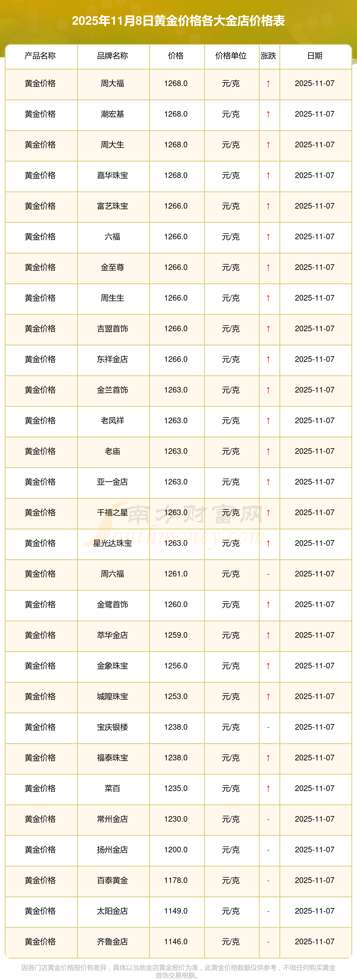 今天是2025年11月8日,寶泉錢幣、金蘭首飾、金蘭首飾、謝瑞麟、謝瑞麟、謝瑞麟、謝瑞麟、謝瑞麟、金銀街、金銀街、金銀街等各大金店品牌黃金價(jià)格最新價(jià)格如下:寶泉錢幣11.4元/克、金蘭首飾1263.0元/克、金蘭首飾560.0元/克、謝瑞麟1202.0元/克、謝瑞麟1268.0元/克、謝瑞麟44260.0、謝瑞麟13080.0、謝瑞麟39960.0、金銀街1243.0元/克、金銀街1258.0元/克、金銀街1248.0元/克。