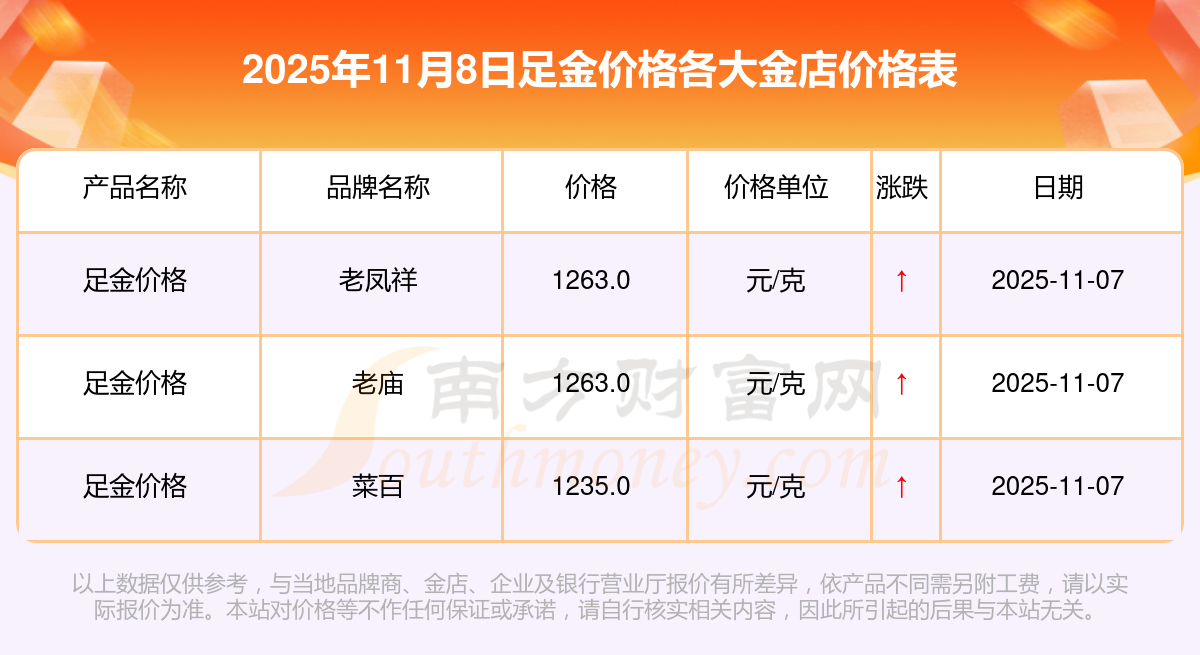 2025年11月8日各大金店足金價格最新價格:寶泉錢幣11.4元/克,金蘭首飾1263.0元/克,金蘭首飾560.0元/克,謝瑞麟1202.0元/克,謝瑞麟1268.0元/克,謝瑞麟44260.0,謝瑞麟13080.0,謝瑞麟39960.0,金銀街1243.0元/克,金銀街1258.0元/克,金銀街1248.0元/克。
