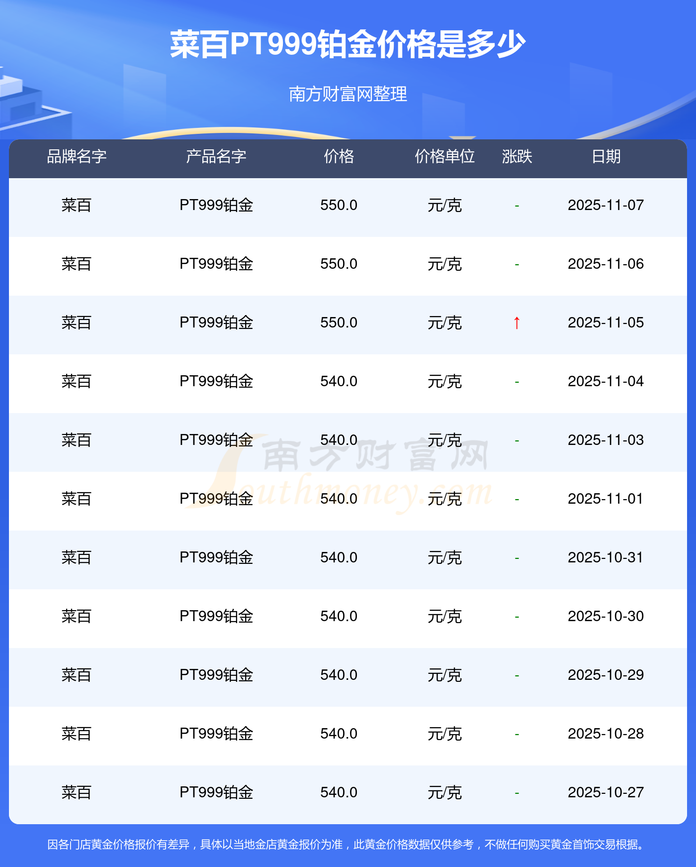 今日菜百 PT999鉑金的最新定價(jià)為550.0元/克。