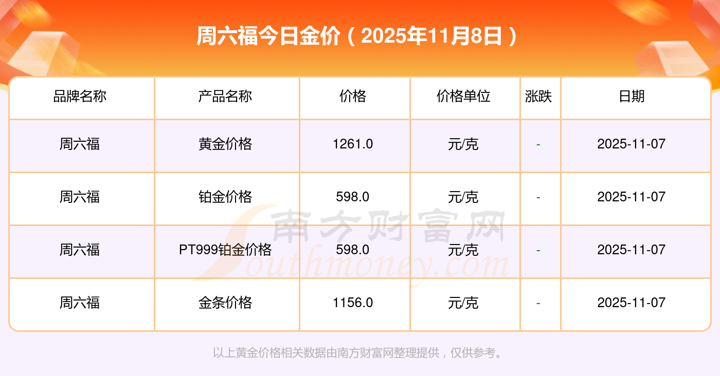 2025年11月8日各大金店黃金價(jià)格最新價(jià)格:寶泉錢(qián)幣11.4元/克,金蘭首飾1263.0元/克,金蘭首飾560.0元/克,謝瑞麟1202.0元/克,謝瑞麟1268.0元/克,謝瑞麟44260.0,謝瑞麟13080.0,謝瑞麟39960.0,金銀街1243.0元/克,金銀街1258.0元/克,金銀街1248.0元/克。