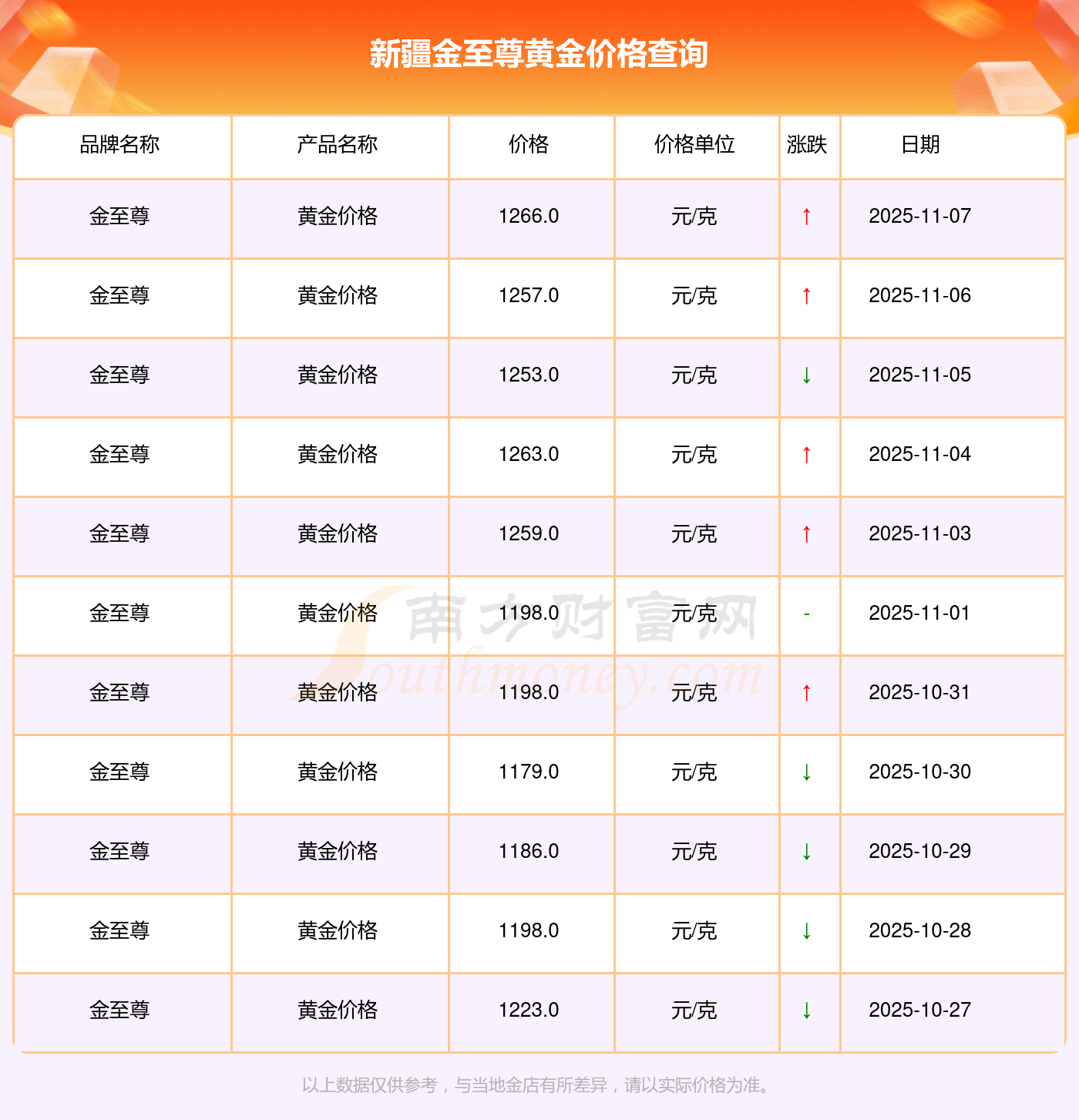 今日(2025年11月8日)新疆金至尊黃金價(jià)格最新價(jià)格為1266.0元/克。
