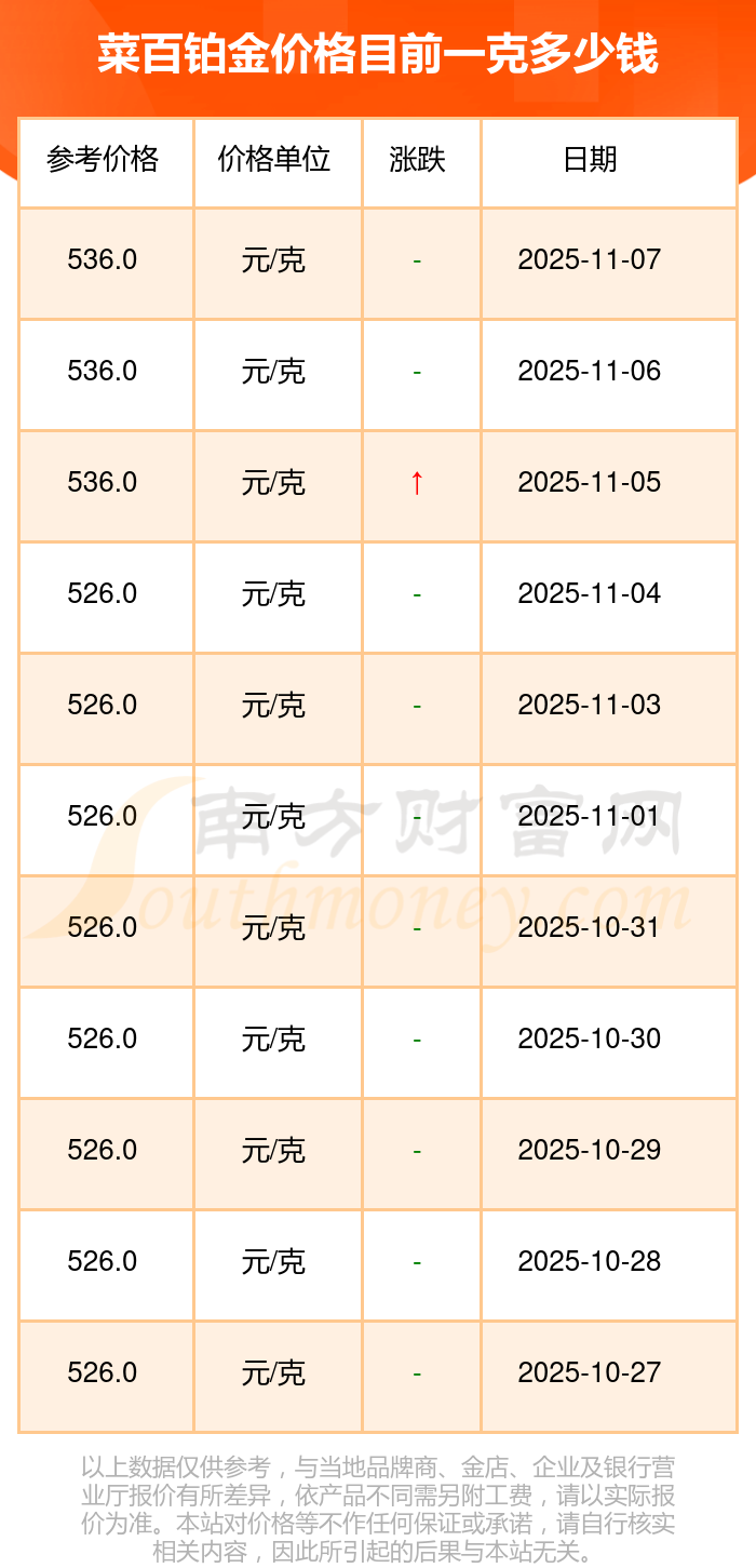 今日(2025年11月8日),菜百鉑金價(jià)格:536.0元/克。