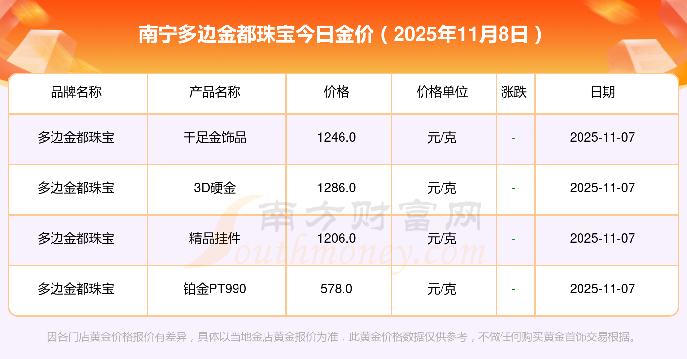 2025年11月8日南寧多邊金都珠寶黃金按克計價,現(xiàn)在多少錢一克?銀條價格11.4元/克,黃金價格1263.0元/克,鉑金價格560.0元/克,金條價格(內(nèi)地)1202.0元/克,金飾價格(內(nèi)地)1268.0元/克,黃金飾品(香港)44260.0,鉑金飾品(香港)13080.0,金條金價(香港)39960.0,投資金條1243.0元/克,工藝金條1258.0元/克,千足金首飾1248.0元/克。