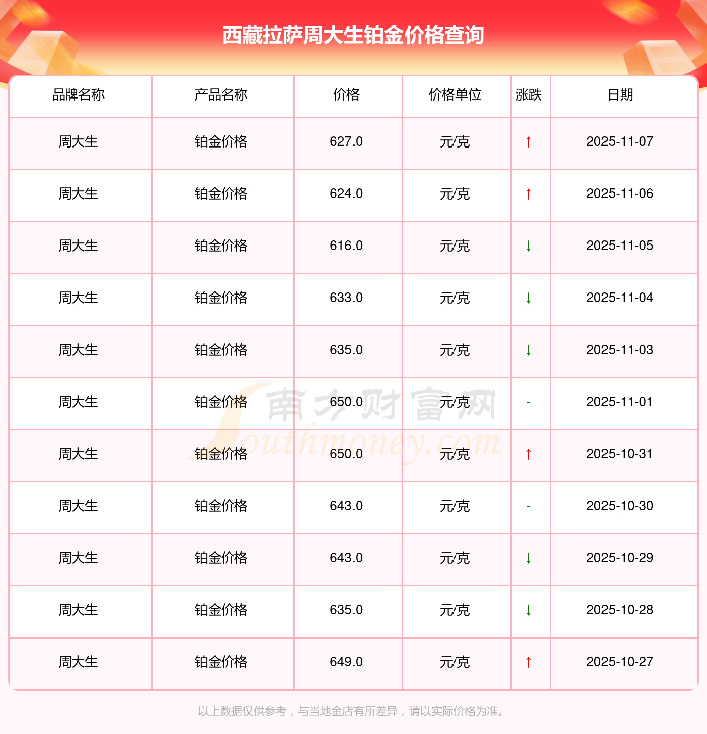 2025年11月8日寶泉錢幣、金蘭首飾、金蘭首飾、謝瑞麟、謝瑞麟、謝瑞麟、謝瑞麟、謝瑞麟、金銀街、金銀街、金銀街等各大金店品牌鉑金價(jià)格最新價(jià)格如下:寶泉錢幣銀條價(jià)格11.4元/克,金蘭首飾黃金價(jià)格1263.0元/克,金蘭首飾鉑金價(jià)格560.0元/克,謝瑞麟金條價(jià)格(內(nèi)地)1202.0元/克,謝瑞麟金飾價(jià)格(內(nèi)地)1268.0元/克,謝瑞麟黃金飾品(香港)44260.0,謝瑞麟鉑金飾品(香港)13080.0,謝瑞麟金條金價(jià)(香港)39960.0,金銀街投資金條1243.0元/克,金銀街工藝金條1258.0元/克,金銀街千足金首飾1248.0元/克。