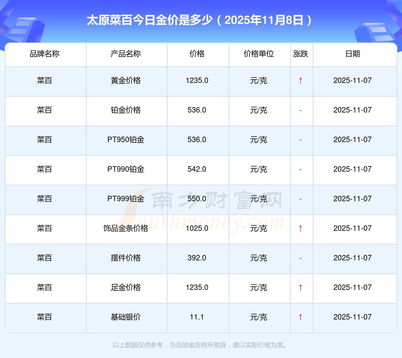 以上數(shù)據(jù)僅供參考,與當(dāng)?shù)仄放粕獭⒔鸬、企業(yè)及銀行營業(yè)廳報(bào)價(jià)有所差異,依產(chǎn)品不同需另附工費(fèi),請(qǐng)以實(shí)際報(bào)價(jià)為準(zhǔn)。本站對(duì)價(jià)格等不作任何保證或承諾,請(qǐng)自行核實(shí)相關(guān)內(nèi)容,因此所引起的后果與本站無關(guān)。