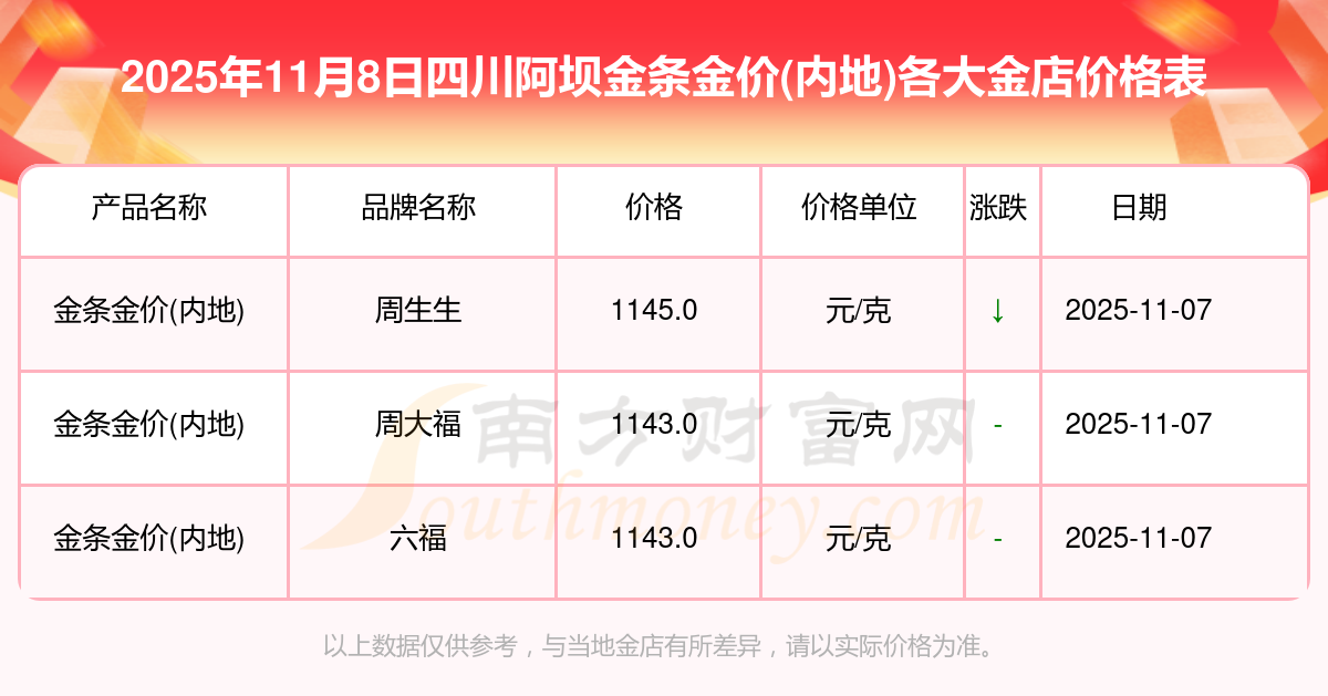 2025年11月8日四川阿壩各大金店金條金價(內(nèi)地)最新價格查詢來了:寶泉錢幣11.4元/克,金蘭首飾1263.0元/克,金蘭首飾560.0元/克,謝瑞麟1202.0元/克,謝瑞麟1268.0元/克,謝瑞麟44260.0,謝瑞麟13080.0,謝瑞麟39960.0,金銀街1243.0元/克,金銀街1258.0元/克,金銀街1248.0元/克。