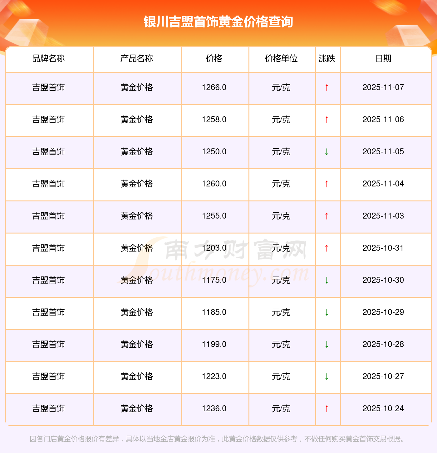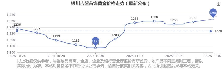 今日(2025年11月8日)銀川吉盟首飾黃金價(jià)格是1266.0元/克。