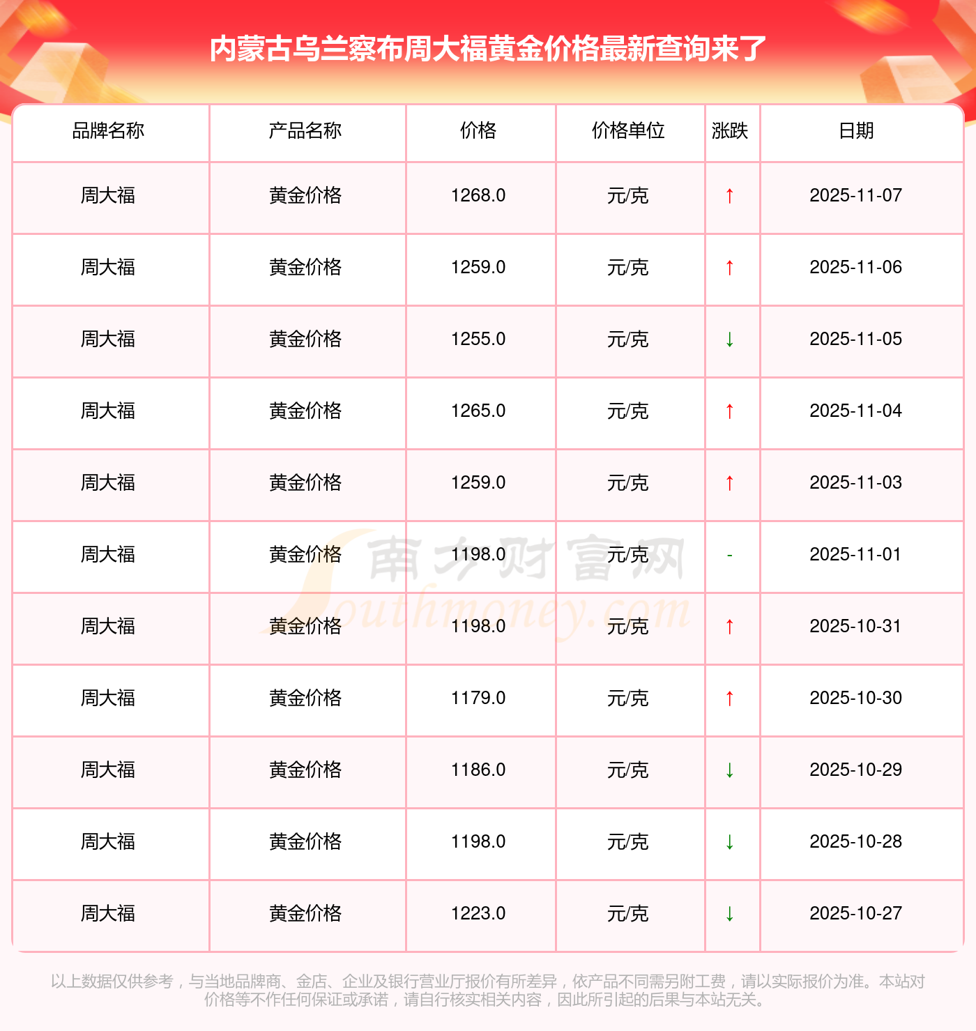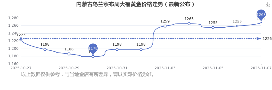 2025年11月8日內(nèi)蒙古烏蘭察布周大福黃金價(jià)格為1268.0元/克。