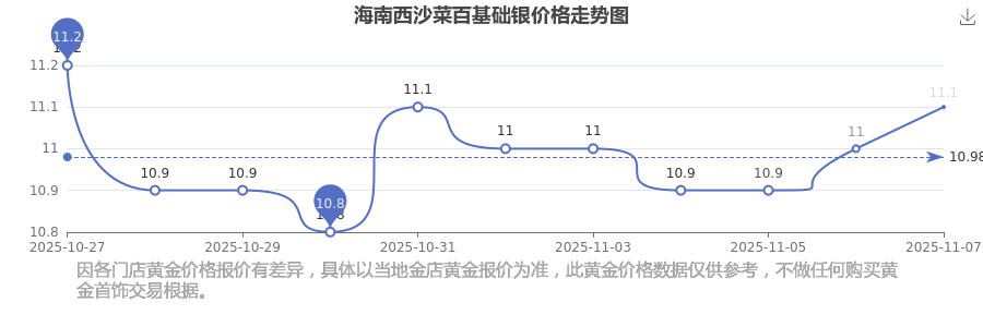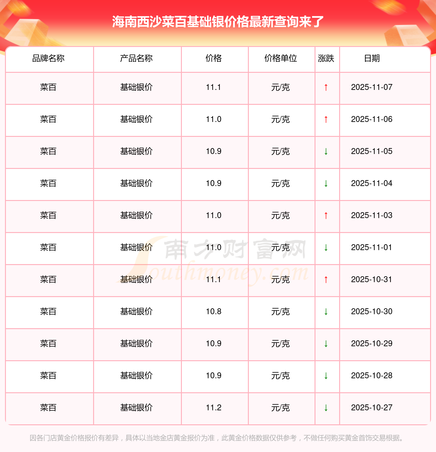 于 2025年11月8日,海南西沙菜百基礎銀價的克價為11.1元/克。